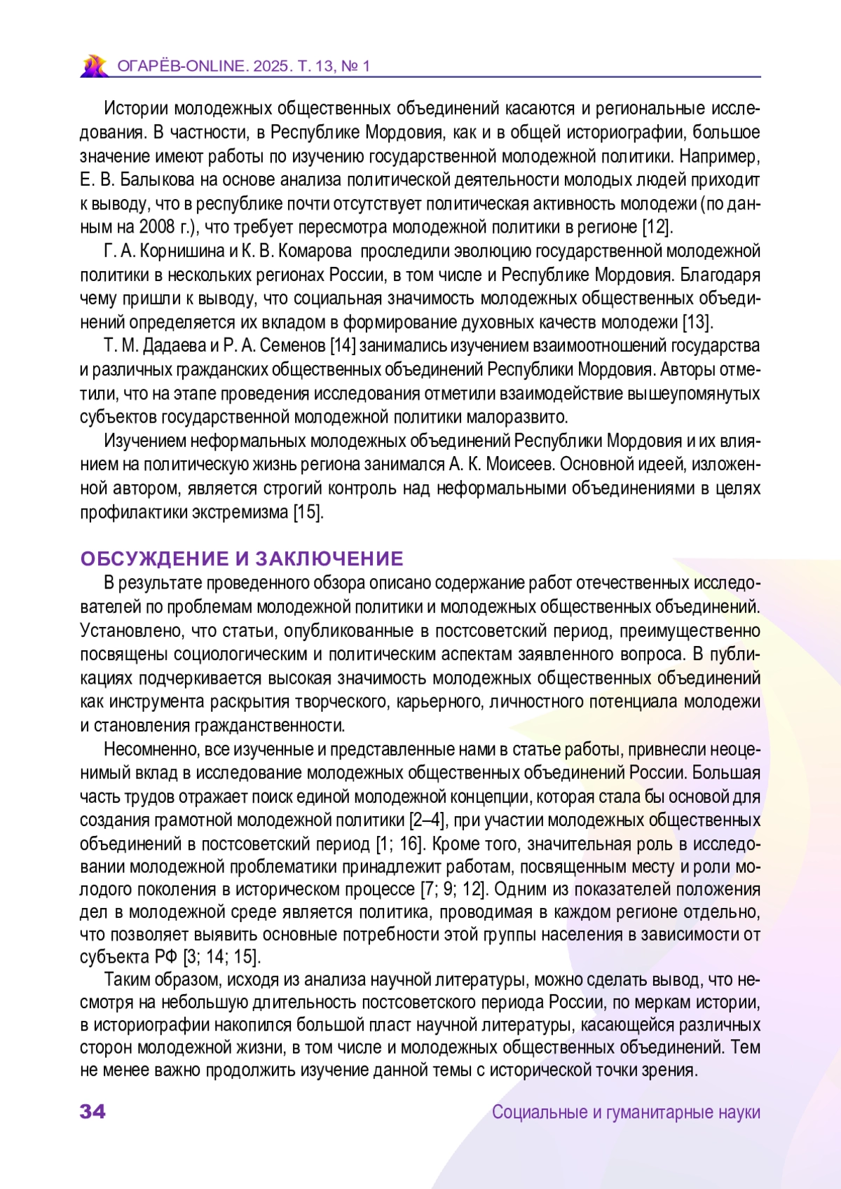 15. Моисеев А. К. Социокультурное осмысление неформальных молодежных организаций Республики Мордовия на современном этапе // Вестник Чувашского университета. 2011. № 1. С. 94-99. URL: https://cyberleninka.ru/article/n/sotsiokulturnoe-osmyslenie-neformalnyh-molodezhnyh-organizatsiy-respubliki-mordoviya-na-sovremennom-etape/viewer (дата обращения: 14.01.2025).