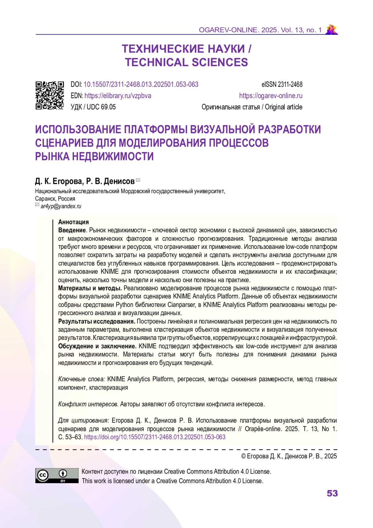 Введение. Рынок недвижимости – ключевой сектор экономики с высокой динамикой цен, зависимостью от макроэкономических факторов и сложностью прогнозирования. Традиционные методы анализа требуют много времени и ресурсов, что ограничивает их применение. Использование low-code платформ позволяет сократить затраты на разработку моделей и сделать инструменты анализа доступными для специалистов без углубленных навыков программирования. Цель исследования – продемонстрировать использование KNIME для прогнозирования стоимости объектов недвижимости и их классификации; оценить, насколько точны модели и насколько они полезны на практике.