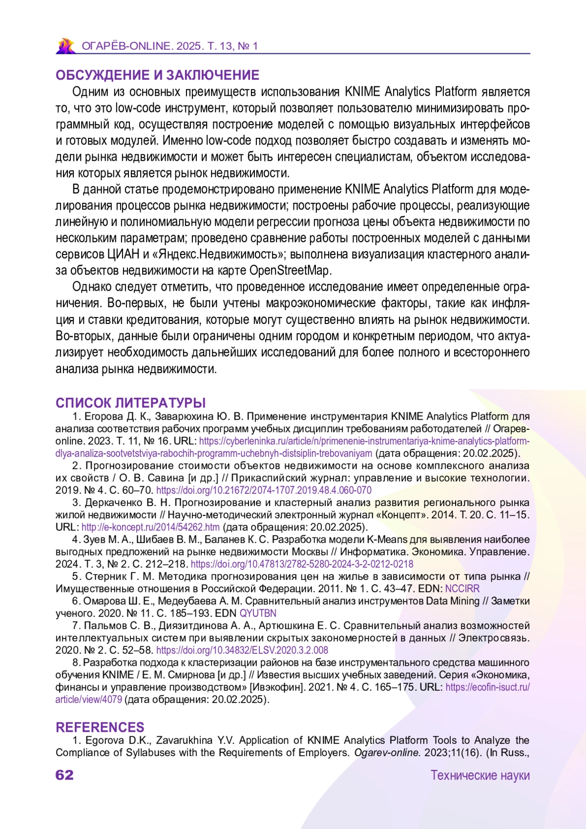 Обсуждение и заключение. KNIME подтвердил эффективность как low-code инструмент для анализа рынка недвижимости. Материалы статьи могут быть полезны для понимания динамики рынка недвижимости и прогнозирования его будущих тенденций.