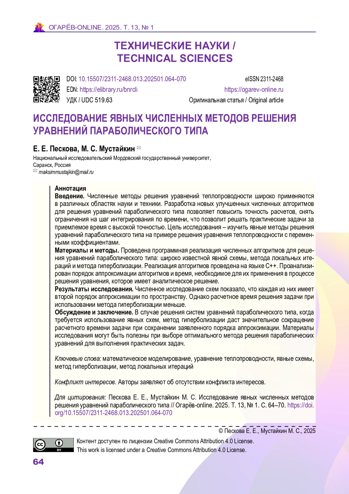 Введение. Численные методы решения уравнений теплопроводности широко применяются в различных областях науки и техники. Разработка новых улучшенных численных алгоритмов для решения уравнений параболического типа позволяет повысить точность расчетов, снять ограничения на шаг интегрирования по времени, что позволит решать практические задачи за приемлемое время с высокой точностью. Цель исследования – изучить явные методы решения уравнений параболического типа на примере решения уравнения теплопроводности с переменными коэффициентами.