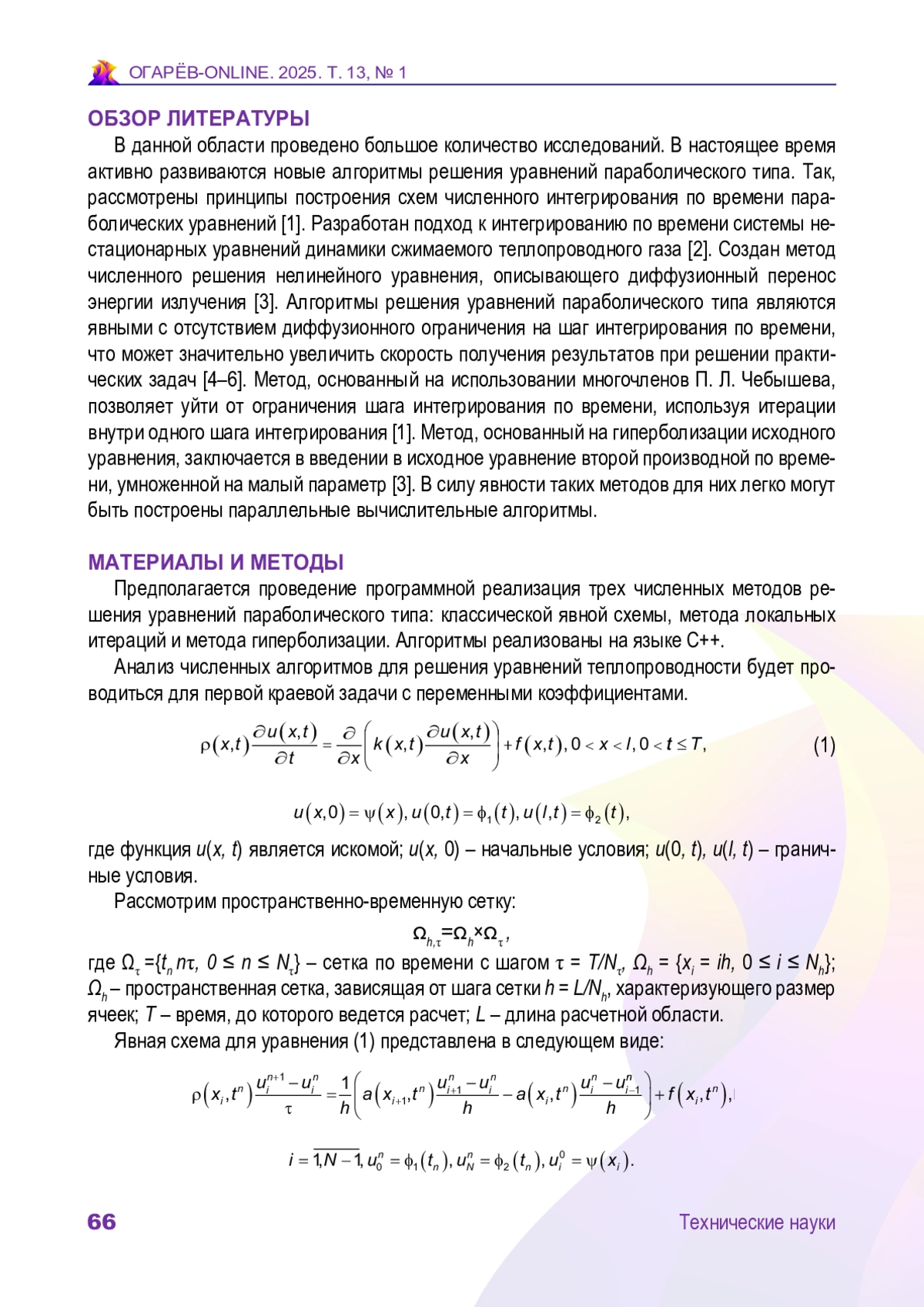 Обсуждение и заключение. В случае решения систем уравнений параболического типа, когда требуется использование явных схем, метод гиперболизации даст значительное сокращение расчетного времени задачи при сохранении заявленного порядка аппроксимации. Материалы исследования могут быть полезны при выборе оптимального метода решения параболических уравнений для выполнения практических задач.