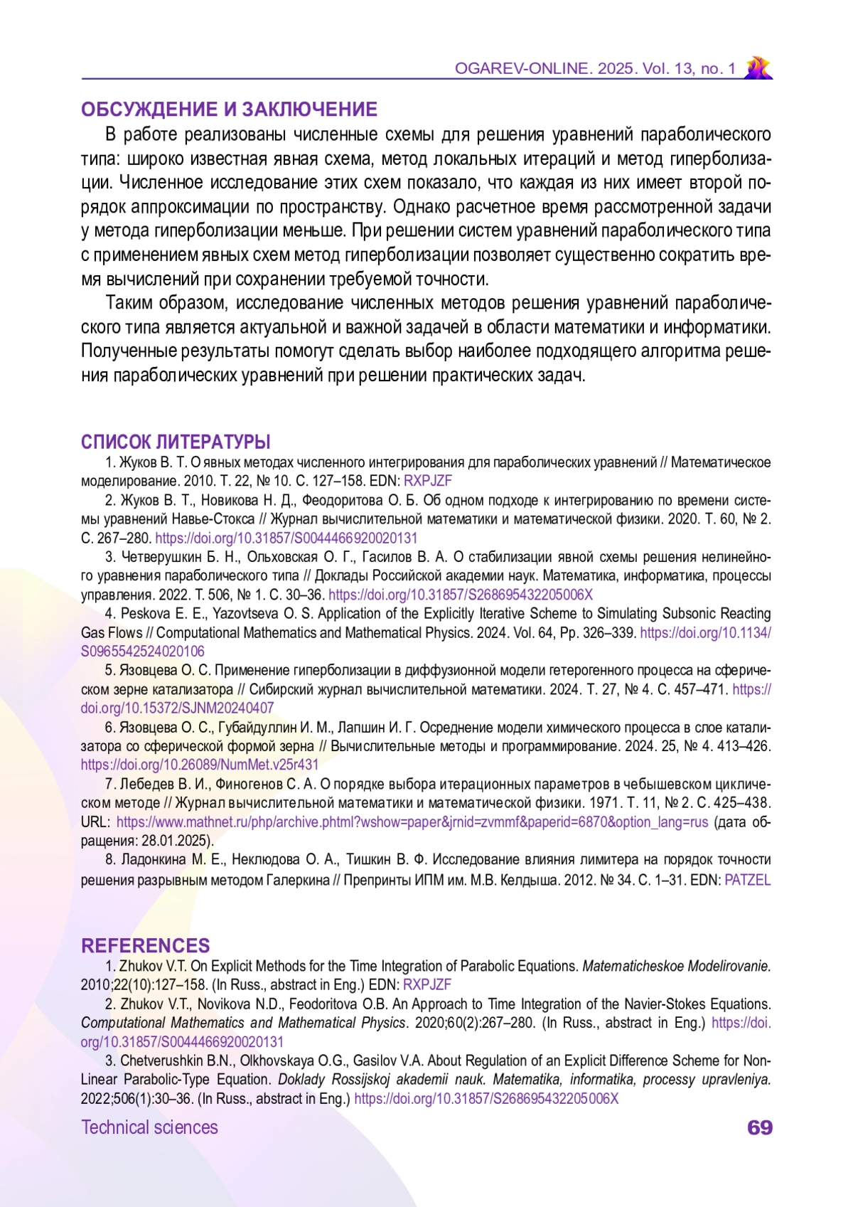 3. Четверушкин Б. Н., Ольховская О. Г., Гасилов В. А. О стабилизации явной схемы решения нелинейного уравнения параболического типа // Доклады Российской академии наук. Математика, информатика, процессы управления. 2022. T. 506, № 1. С. 30-36. DOI: 10.31857/S268695432205006X
