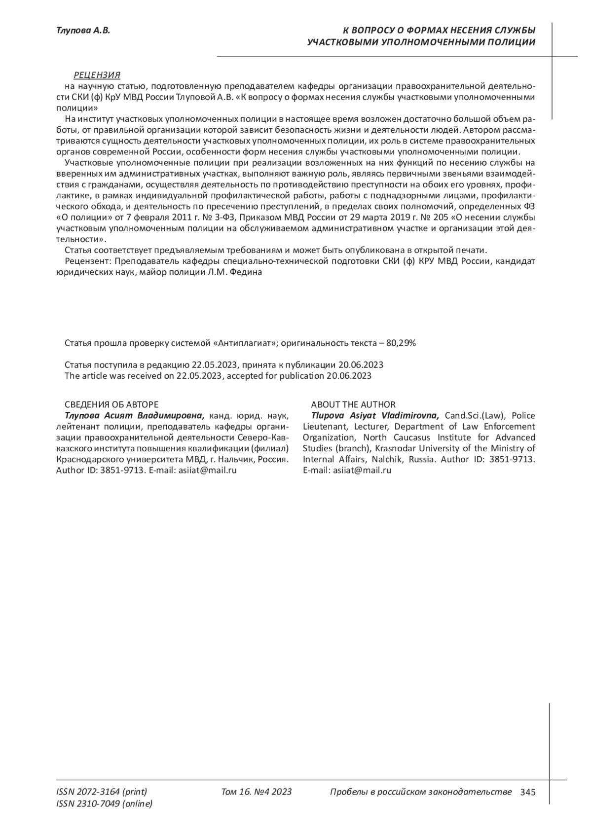 4. Антонов Н.И., Бирюков В.В. Актуальные вопросы организации приема граждан участковыми уполномоченными полиции // Академическая мысль. 2021. № 3 (16). С. 126-130. EDN: TEJEZP
