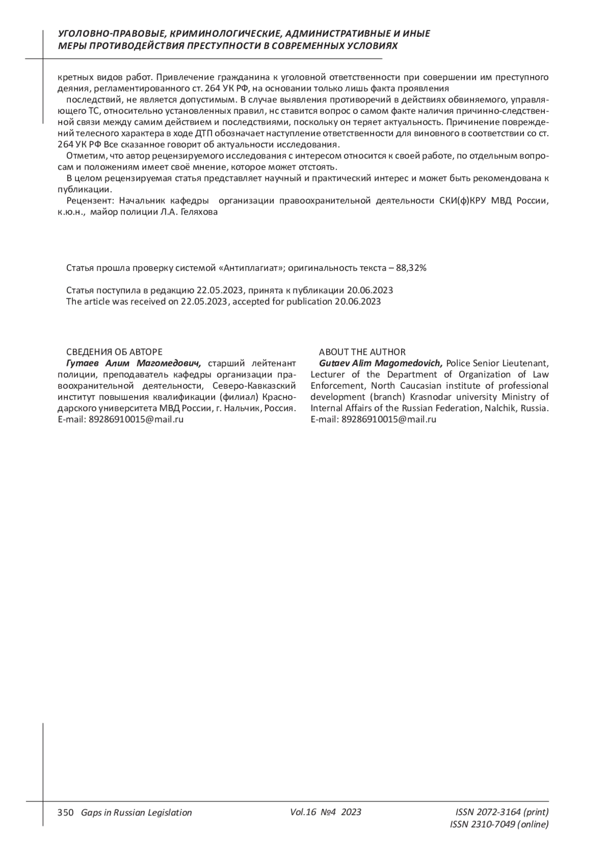 6. Гутаев А.М. Правовые основы предупреждения преступлений в сфере безопасности дорожного движения // Пробелы в российском законодательстве. 2021. Т. 14. №3. С. 154-157. EDN: OAWJZU