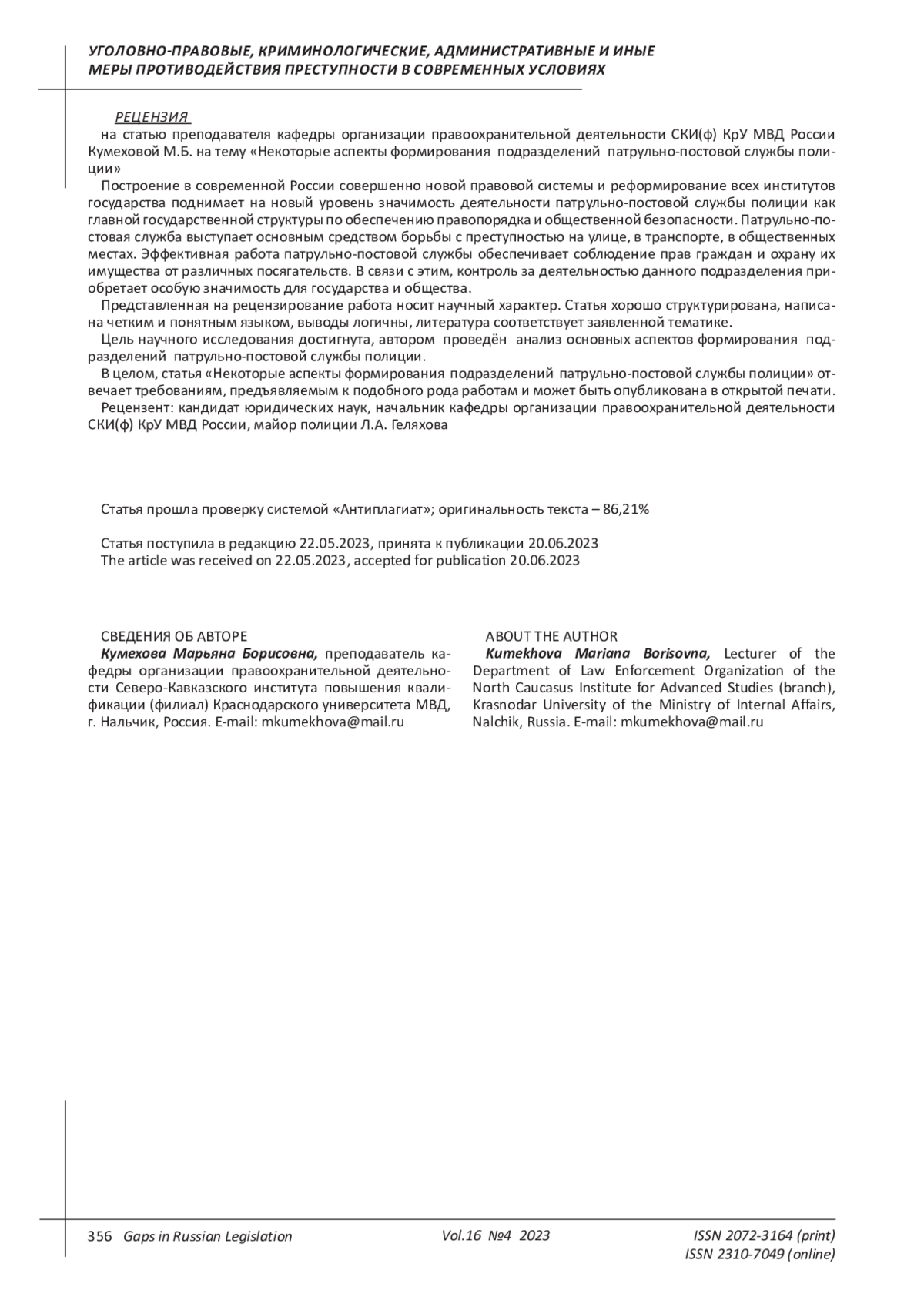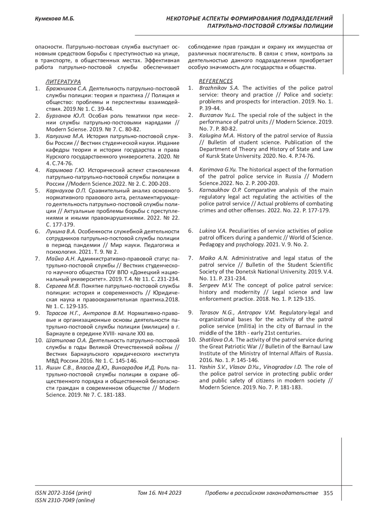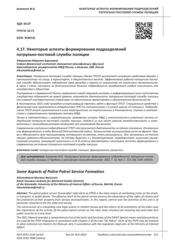 4. Каримова Г.Ю. Исторический аспект становления патрульно-патрульно-постовой службы полиции в России //Modern Science.2022. № 2. С. 200-203.