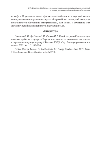 1. Савичева Е. М., Бребдани А. М., Рыжов И. В. Китай и страны Совета сотрудничества арабских государств Персидского залива: от экономических сделок к стратегическому партнерству // Вестник РУДН. Сер.: Международные отношения. 2022. № 1. С. 180-196. EDN: NMVDUL