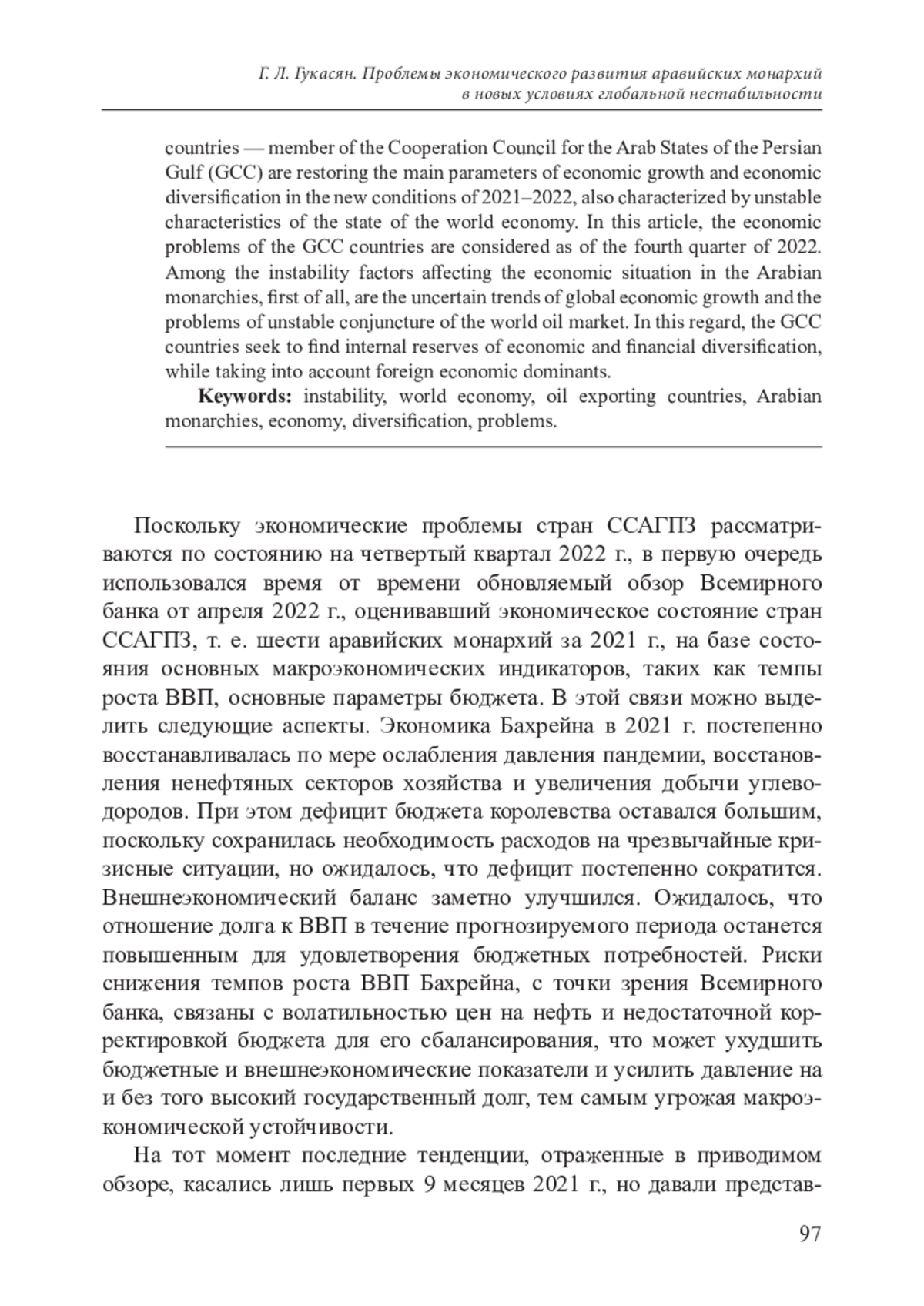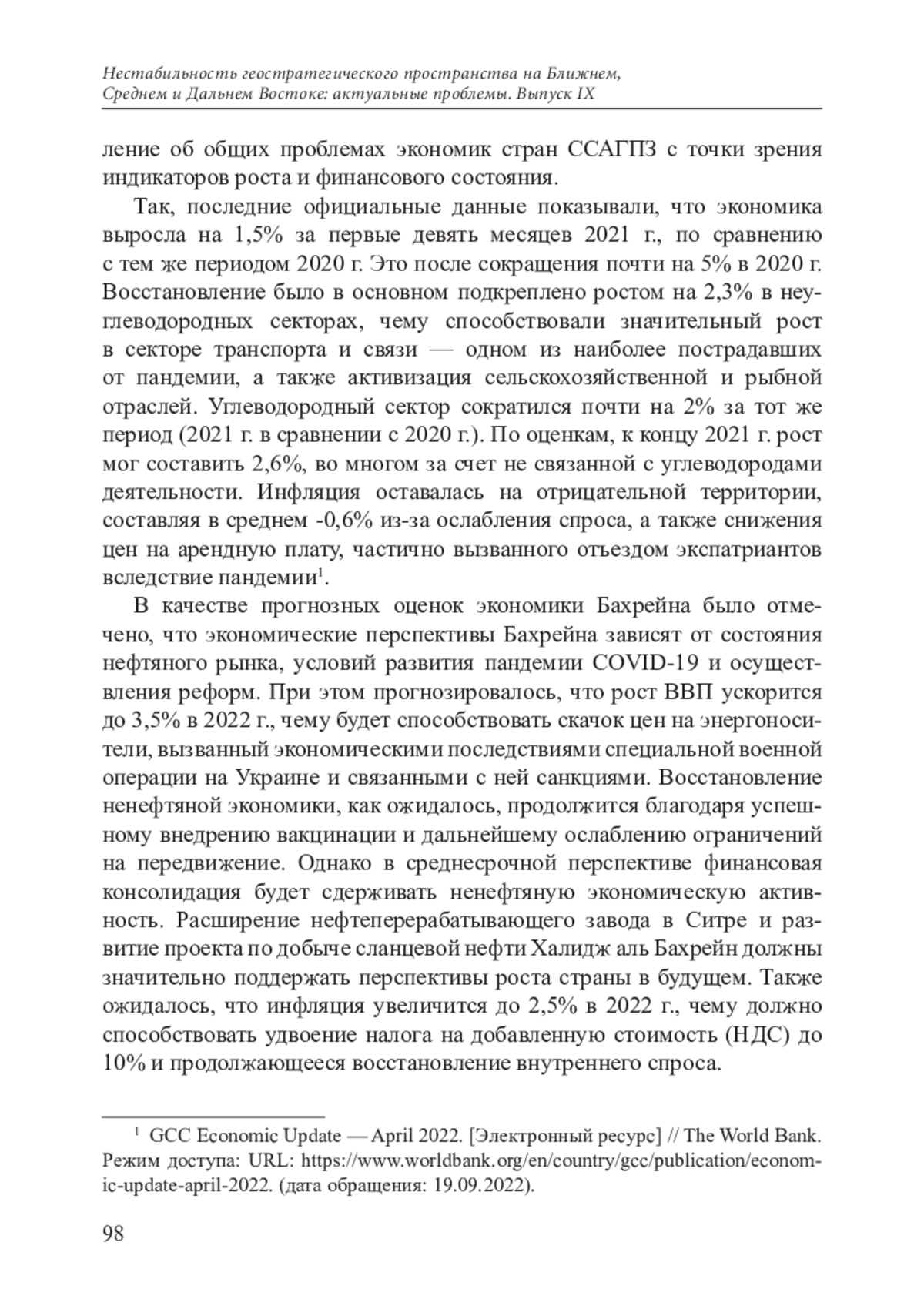 Поскольку экономические проблемы стран ССАГПЗ рассматриваются по состоянию на четвертый квартал 2022 г., в первую очередь использовался время от времени обновляемый обзор Всемирного банка от апреля 2022 г., оценивавший экономическое состояние стран ССАГПЗ, т. е. шести аравийских монархий за 2021 г., на базе состояния основных макроэкономических индикаторов, таких как темпы роста ВВП, основные параметры бюджета.