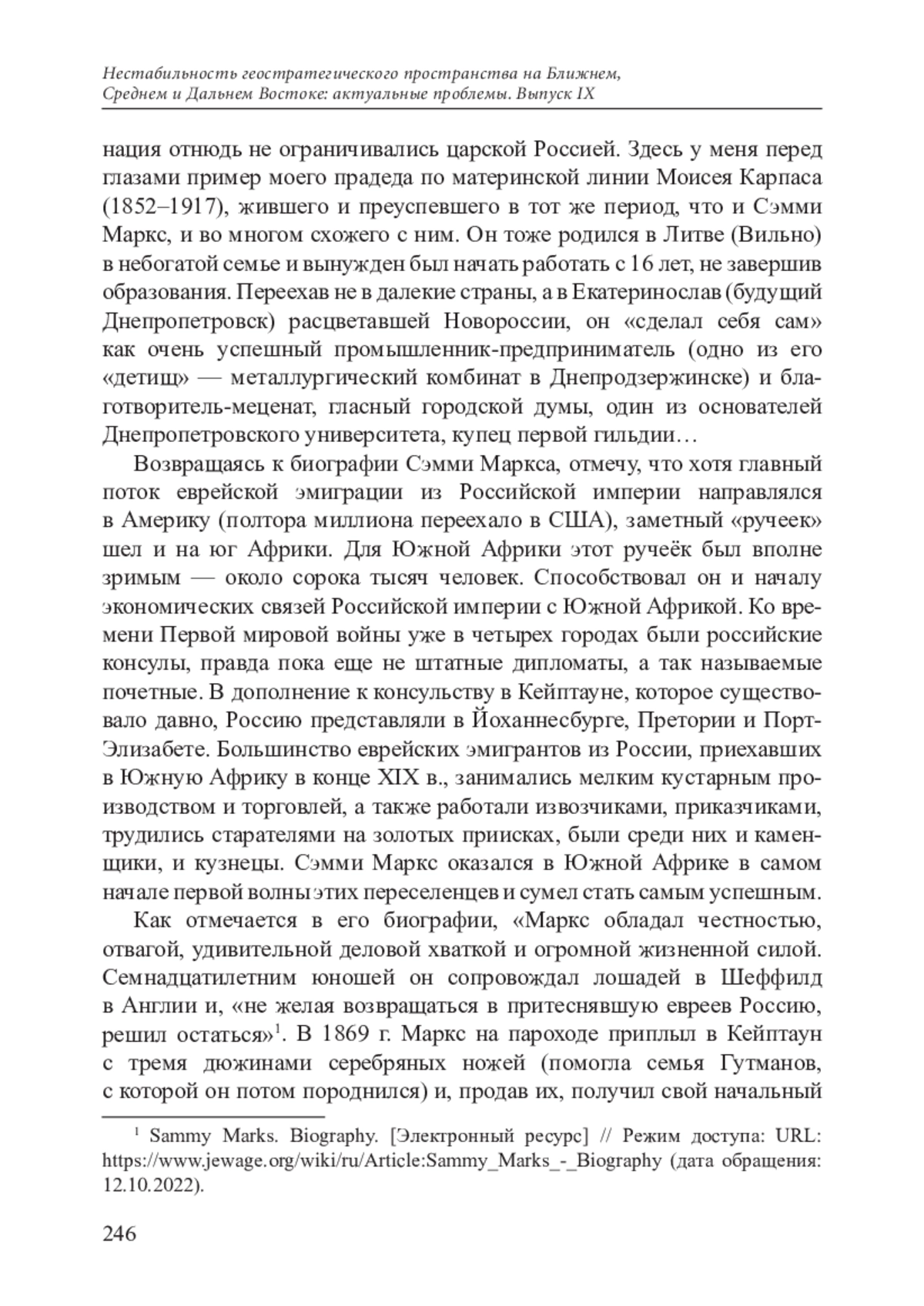 В статье рассказывается удивительная история феноменального успеха в Южной Африке в конце XIX — начале XX в. выходца из Российской империи Сэмми (Самуила) Маркса, от торговца вразнос до мультимиллионера и «некоронованного короля» Трансвааля, заложившего вместе со своим родственником Исааком Льюисом основы многих отраслей южноафриканской индустриальной экономики и сыгравшего важную роль в мирном завершении англо-бурской войны 1899–1902 гг.