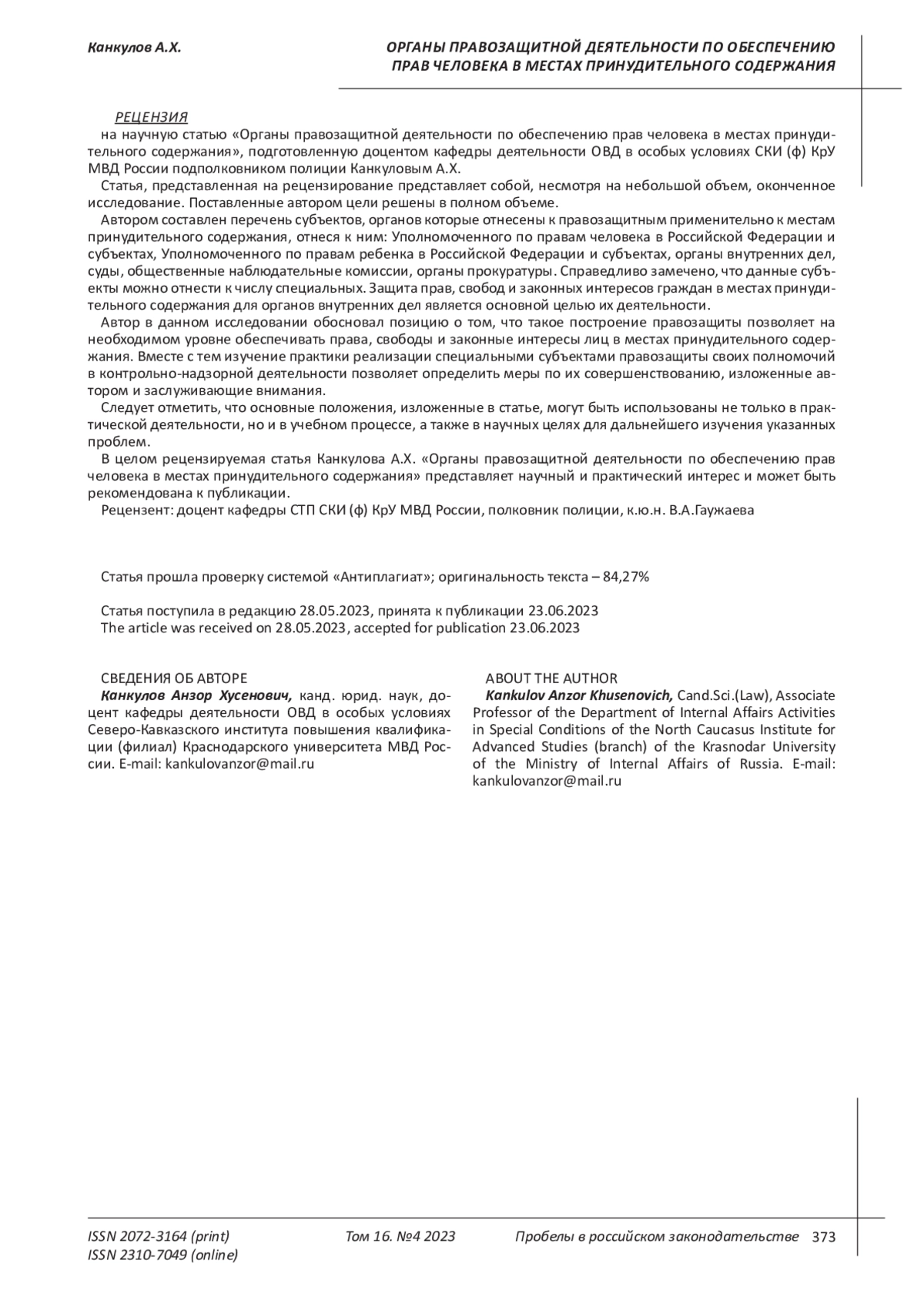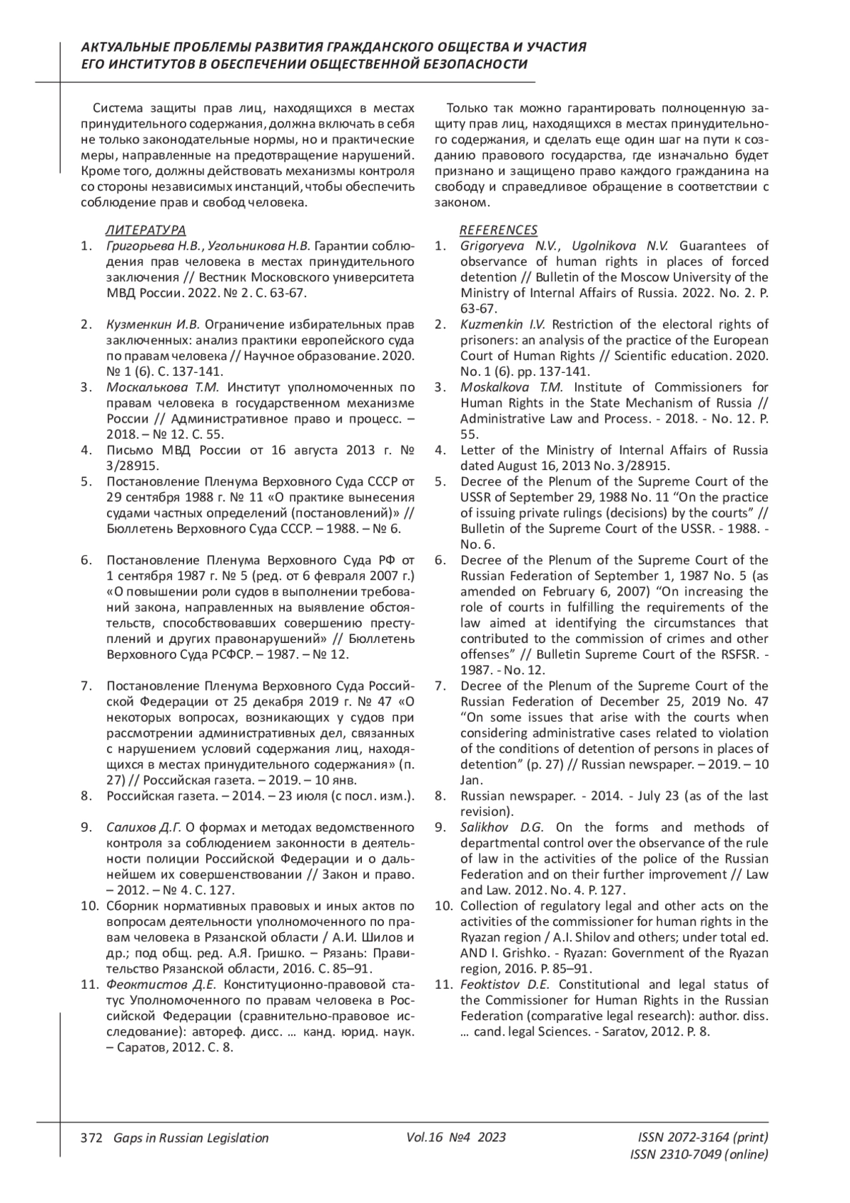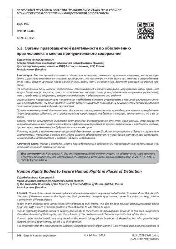 КАНКУЛОВ А. Х. ОРГАНЫ ПРАВОЗАЩИТНОЙ ДЕЯТЕЛЬНОСТИ ПО ОБЕСПЕЧЕНИЮ ПРАВ ЧЕЛОВЕКА В МЕСТАХ ПРИНУДИТЕЛЬНОГО СОДЕРЖАНИЯ // ПРОБЕЛЫ В РОССИЙСКОМ ЗАКОНОДАТЕЛЬСТВЕ. 2023. Т. 16 № 4