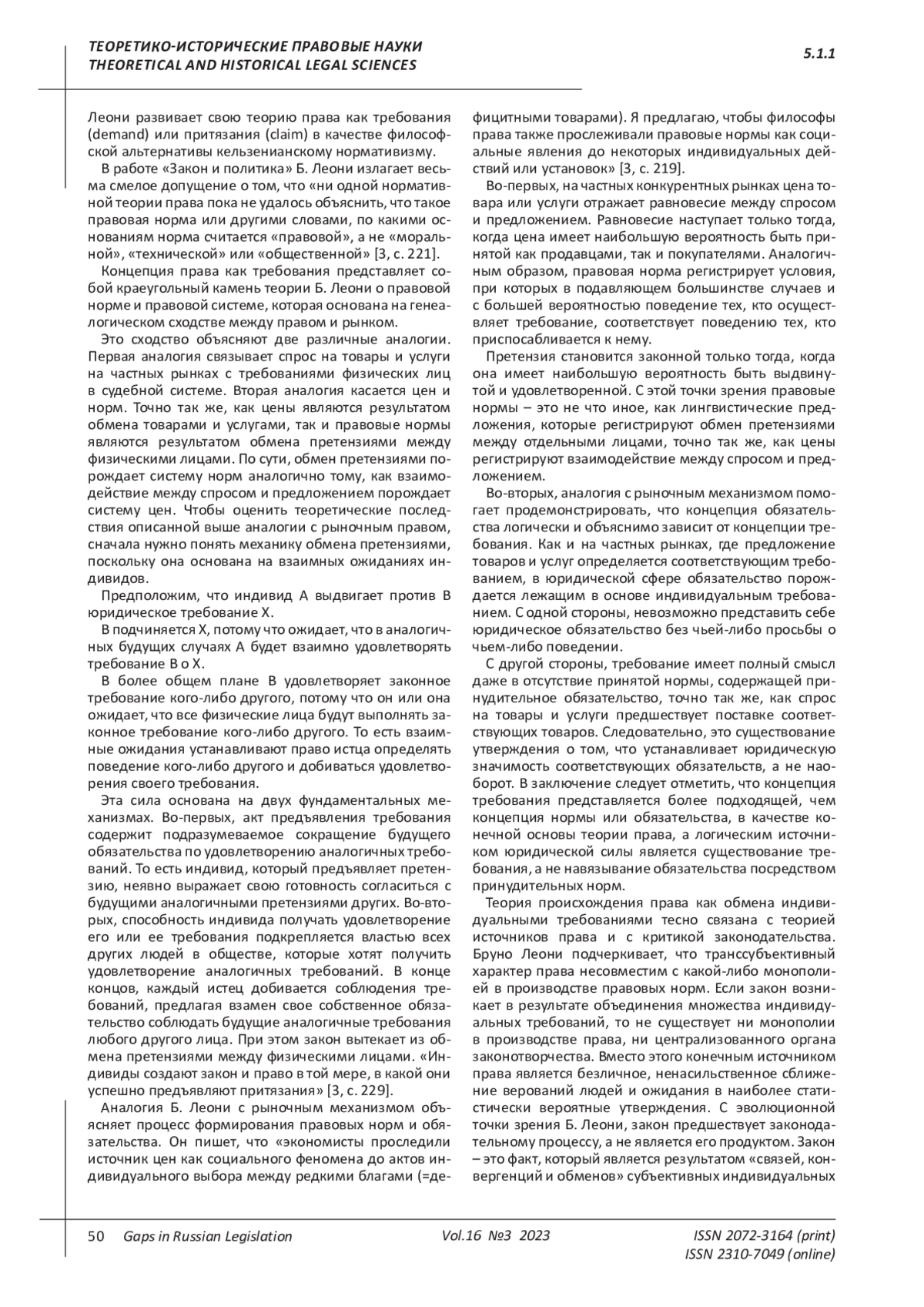 Актуальность темы исследования. Ввиду смены идеологической парадигмы в постсоветский период вопросы методологии теории и истории права обрели новое звучание, вовлекая исследователей в многочисленные дискуссии. В то же время, правовой позитивизм, признавая в качестве правовых только нормы позитивного права, напрямую увязывая последнее с институтом государства, до сих пор доминирует в отечественной юридической науке. Приходится констатировать, что позитивизм фактически игнорирует сложный фундамент под институтом права, который возникает словно из небытия. Методология изучения генезиса права за границами позитивистской парадигмы в отечественном правоведении является не самым сильным козырем. В силу этого автор обращает читателя к творчеству итальянского философа, антифашиста, ученого, юриста Бруно Леони (1913-1967), оказавшего значительное влияние на развитие философских и юридических взглядов XX столетия. Основывая и развивая свою концепцию правопонимания на постулатах римского права, взглядах представителей различных поколений австрийской школы экономической теории, Бруно Леони осуществил одну из самых обоснованных и удачных попыток противостоять доминированию в европейской правовой мысли нормативизма Г. Кельзена. Цель написания исследовательской работы заключается в авторском осмыслении творческого наследия Бруно Леони, определении места его научных идей в юридическом мировоззрении XX века, обращении внимания на продуктивные основы его методологии в изучении права. Основным методом, используемым при написании работы, является диалектический метод познания окружающей действительности. Кроме того, при написании работы автором использовался ряд общих и специальных методов научного познания: анализ, синтез, индукция, дедукция, исторический, сравнительно-правовой, формально-юридические и другие методы научного познания. Выводы, полученные в ходе исследования, позволяют утверждать, что интерес к творческому наследию Бруно Леони будет способствовать дальнейшему осмыслению и развитию научных идей в области юриспруденции, философии и экономики.