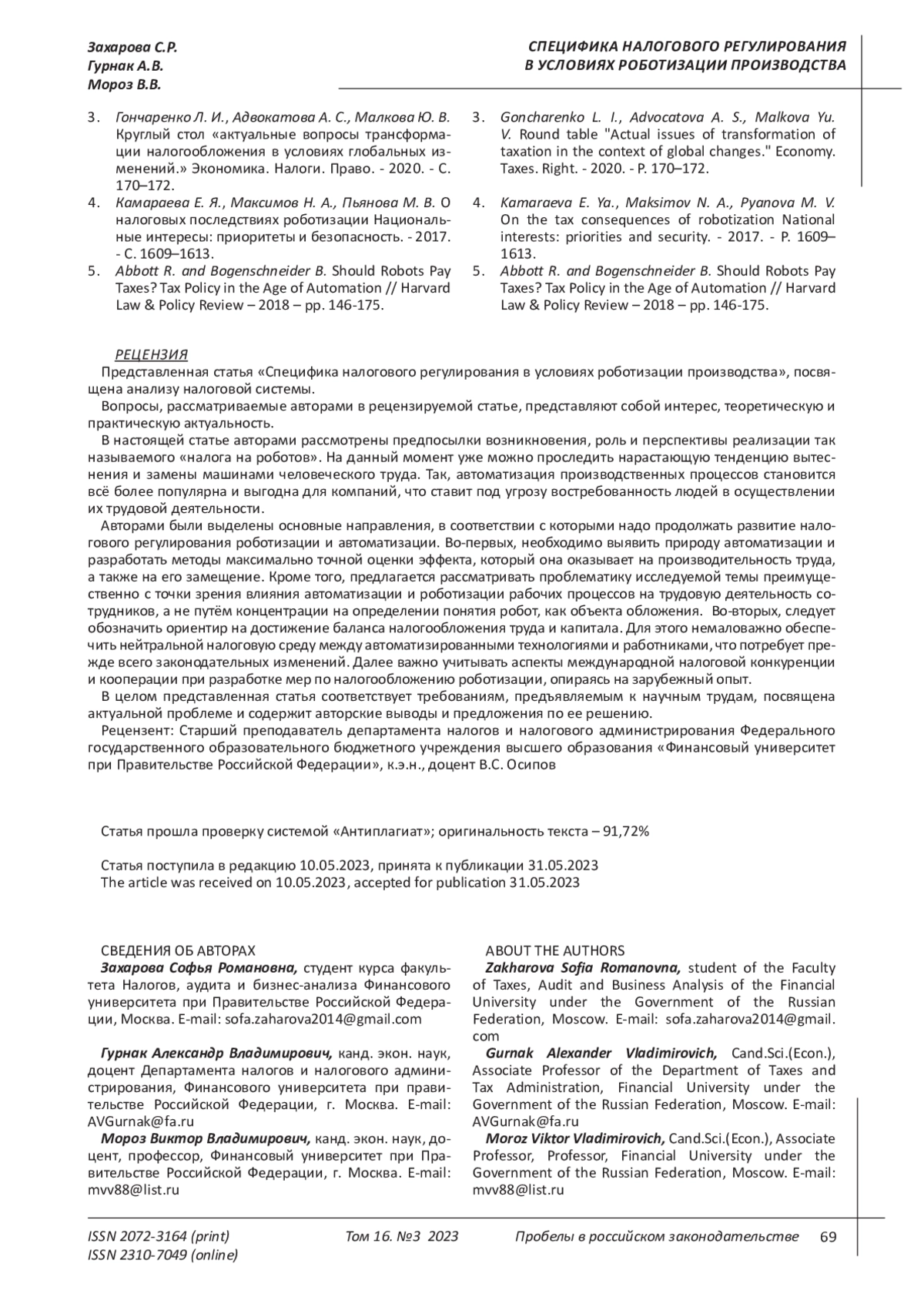 5. Abbott R. and Bogenschneider B. Should Robots Pay Taxes? Tax Policy in the Age of Automation // Harvard Law & Policy Review - 2018 - pp. 146-175.