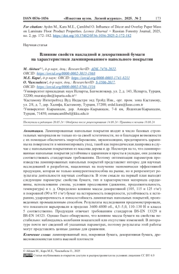 Ламинированные напольные покрытия входят в число базовых строительных материалов не только из-за своей эстетичности, но и благодаря возможности с их помощью обеспечить энергосбережение, звукоизоляцию, предотвратить царапины на поверхности и минимизировать уход, такой как периодическая лакировка в случае с напольными покрытиями из массива дерева и др. Несмотря на то, что ламинированные напольные покрытия устойчивы к царапинам и просты в укладке, они должны соответствовать стандартным требованиям. Поэтому оптимизация параметров производства ламинированных напольных покрытий представляет интерес для научных исследований и разработок, нацеленных на получение экономически эффективной продукции, которая не только конкурентноспособна на рынке, но и репрезентует результаты деятельности научных сообществ. В этом смысле на первый план выходят следующие параметры: свойства бумаги, тип и характеристики материала сердцевины, использование смолы, условия прессования (давление, продолжительность, температура) и т. д. Определено влияние массы декоративной (105, 115 и 125 г/м2) и покровной (90 и 95 г/м2) бумаг на истираемость поверхности, устойчивость к истиранию, ударопрочность и износостойкость ламинатных напольных покрытий, произведенных промышленным способом. Результаты исследования продемонстрировали, что показатели варьировали в пределах 3600-4800 об., 4,5-5,0, 110-130 Н и класса 5 соответственно. Продукция отвечает требованиям стандартов BS-EN 13329 и BS-EN 14323. Однако было обнаружено, что влияние массы бумаги на свойства нестабильно: наблюдались колебания показателей или отсутствие изменений. В литературе почти нет сведений об указанных параметрах, поэтому результаты этой работы могут представлять ценные данные для сравнения.