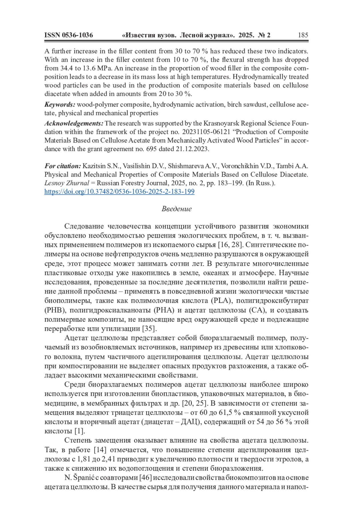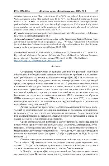 6. Казицин С.Н., Василишин Д.В., Шишмарева А.В., Добрынкина Д.Д., Ворончихин В.Д. Исследование процесса получения ацетата целлюлозы из механоактивированных частиц березы // Хвойные бореал. зоны. 2024. Т. 42, No 2. С. 73-79. EDN: EIJTZD