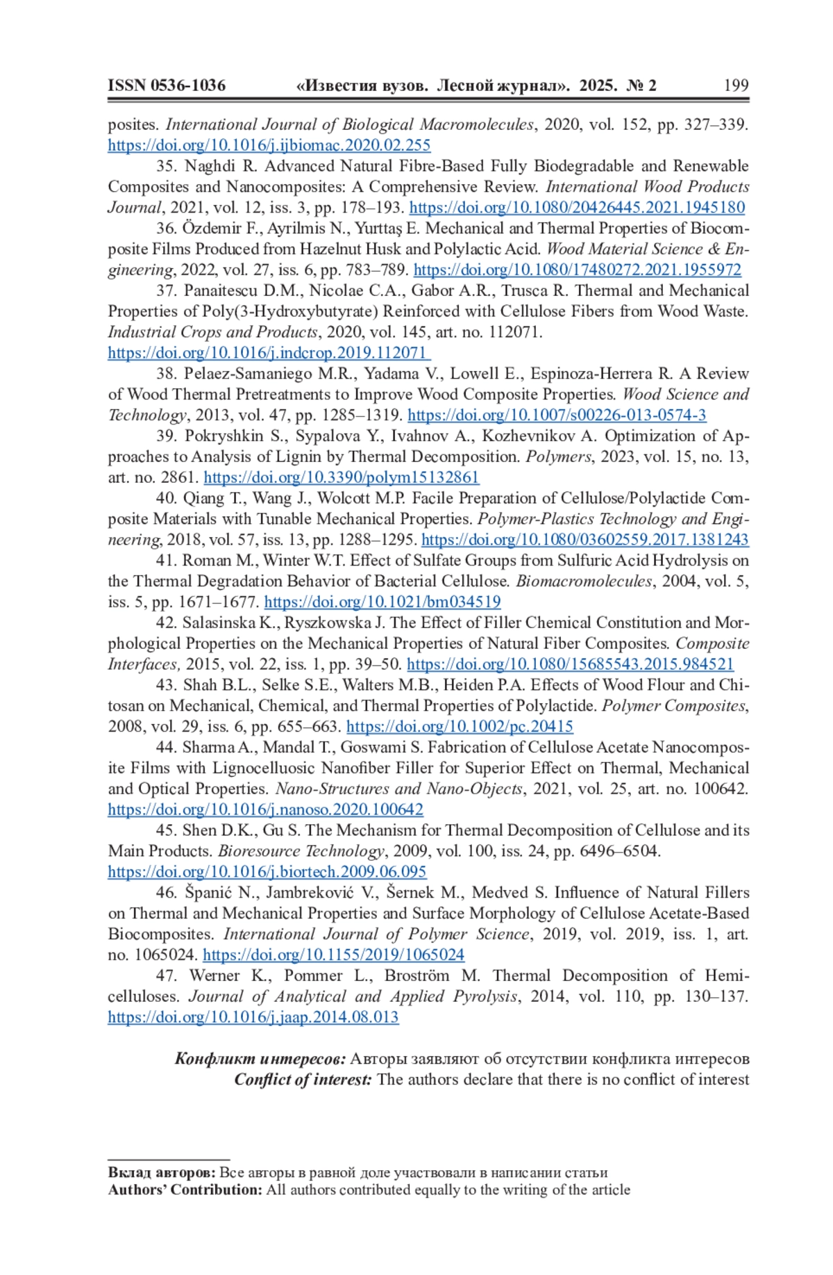 37. Panaitescu D.M., Nicolae C.A., Gabor A.R., Trusca R. Thermal and Mechanical Properties of Poly (3-Hydroxybutyrate) Reinforced with Cellulose Fibers from Wood Waste. Industrial Crops and Products, 2020, vol. 145, art. no. 112071. DOI: 10.1016/j.indcrop.2019.112071