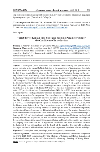 Кедр корейский (Pínus koraiénsis) является ценным лесообразующим древесным видом, который выращивают не только в ареале, но и в условиях интродукции. Наше исследование направлено на сопоставление изменчивости показателей шишек и семенного потомства дерева КО-9, отобранного по урожайности на плантации «Известковая», расположенной на территории Караульного лесничества Учебно-опытного лесхоза Сибирского государственного университета науки и технологий им. академика М. Ф. Решетнёва (пригородная зона г. Красноярка). Семена кедра были заготовлены осенью 1965 г. в насаждении Приморского края (Тудо-Вакское лесничество; 46° 54’ с. ш. 134° 12’ в. д., 200 м над ур. м.; III класс бонитета, IV класс возраста). Схема посадки на плантации - 5×5 м. Дерево в возрасте 31 год образовало первые шишки. С 1999 по 2013 гг. их сформировалось 80 шт., при среднем значении в данном варианте - 23 шт. Превышение составило 247,8 %. В 2020 г. на обследованном дереве было 46 шишек. Наибольшее количество всходов появилось из 8 шишек, показатели которых взяты для сопоставления. Длина шишек с дерева No 24 составила 16 см, No 3 - 12 см. Диаметр шишек варьировал от 7,5 см (шишка No 21) до 9,7 см (No 24). Между длиной и диаметром шишек установлена умеренная теснота связи (r = 0,488). Средняя высота 1-летних сеянцев кедра корейского равнялась 3,8 см, при наибольшем показателе 4,4 см (потомство из шишки No 45). Уровень изменчивости по количеству и длине первичной хвои высокий. По количеству первичной хвои выделяется потомство из шишки No 44, длине - No 3; по количеству семядолей - также из шишки No 44 (13,3 шт.), по длине - No 24 (3,3 см). Значительная теснота связи установлена между длиной первичной хвои и семядолей, высотой 1-летних сеянцев и количеством семядолей, длиной шишек и высотой 1-летних сеянцев. В 2-летнем возрасте наибольшая высота и длина хвои были у потомства из шишки - No 44. Установлена значительная теснота связи для высоты 2-летних сеянцев и длины хвои. Двухлетние сеянцы, наибольшее количество которых получено из крупных шишек, были отселектированы по высоте.