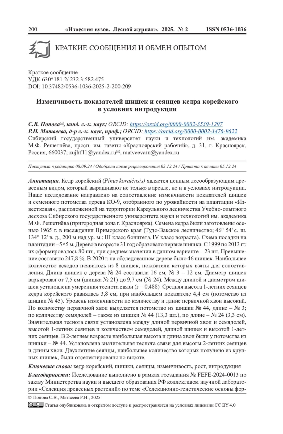 15. Матвеева Р.Н., Братилова Н.П., Буторова О.Ф. Изменчивость показателей роста и генеративного развития кедровых сосен на плантации зеленой зоны города Красноярска // Сиб. лесн. журн. 2014. No 2. С. 81-86. EDN: SMHFWZ