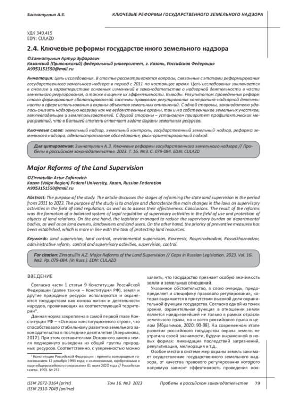Korolev S.Y. Land Supervision: Transformation in the Light of the State Policy on the Use of the Land Fund of the Russian Federation / ed. S.Y. Korolev // Legal Policy and Legal Life. 2021. № 2. Pp. 16-25. EDN: AUTODP