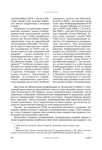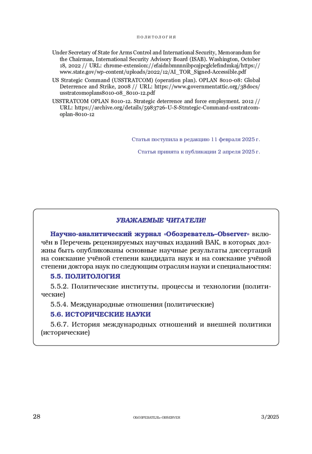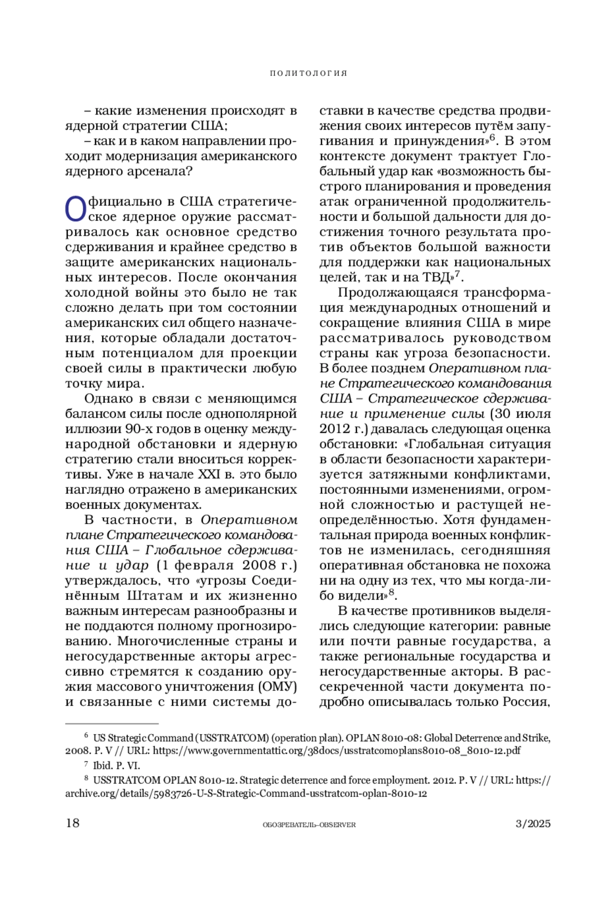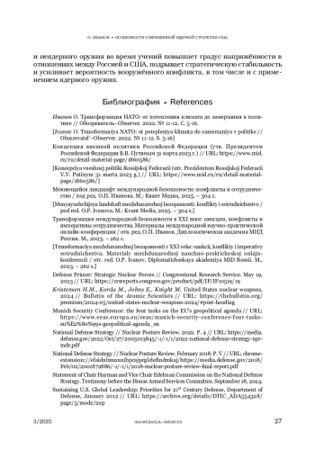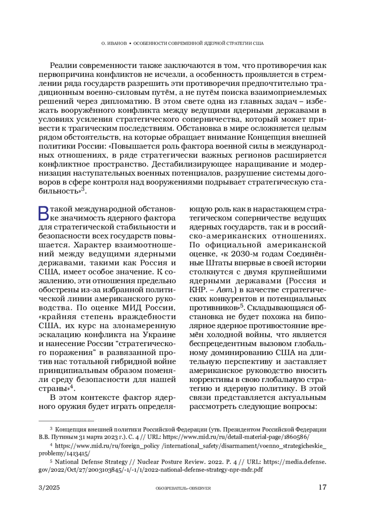 ИВАНОВ О. П. ОСОБЕННОСТИ СОВРЕМЕННОЙ ЯДЕРНОЙ СТРАТЕГИИ США // ОБОЗРЕВАТЕЛЬ. 2025. № 3