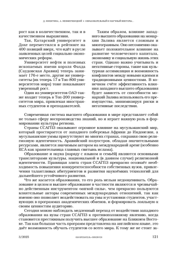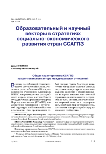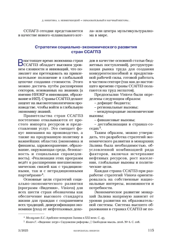 Авторы рассматривают реализацию странами ССАГПЗ стратегий социально-экономического развития, предпосылки и своевременность их внедрения. Особое внимание уделяется реформированию сферы высшего образования и науки, которые нужны для успешной диверсификации экономик. Была проанализирована динамика рейтинга вузов ССАГПЗ в мировом академическом рейтинге университетов.