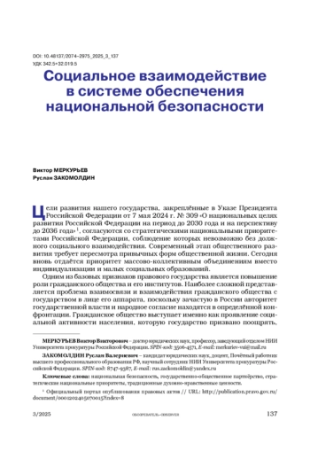 Авторами рассматриваются государственно-общественные объединения как форма социального взаимодействия и элемент системы национальной безопасности. Отмечается востребованность и перспективность данного института в решении ключевых задач государственной политики в стратегических сферах, имеющих значение для обеспечения национальной безопасности. Указывается на несовершенство правового регулирования данного института. Делается вывод о необходимости принятия специального закона об общественных организациях с участием государства.