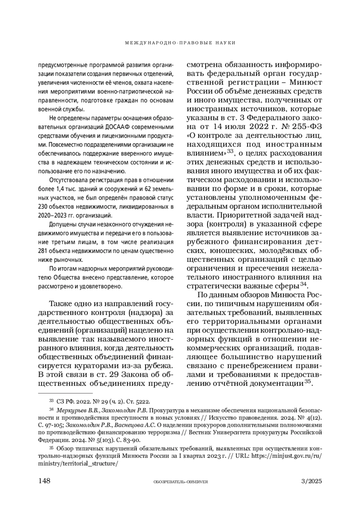 1. Закомолдин Р.В. Общественно-государственные организации в системе обеспечения национальной и военной (оборонной) безопасности Российской Федерации в условиях новых вызовов и угроз // Военное право. 2025. № 2(90). С. 28-36. [Zakomoldin R.V. Obshchestvenno-gosudarstvennye organizacii v sisteme obespecheniya nacional’noj i voennoj (oboronnoj) bezopasnosti Rossijskoj Federacii v usloviyah novyh vyzovov i ugroz // Voennoe pravo. 2025. № 2(90). S. 28-36]