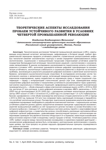 Технологические достижения Четвертой промышленной революции («4IR»), охватывающие искусственный интеллект, автоматизацию, цифровизацию и Интернет вещей, требуют фундаментальной переоценки парадигм устойчивого развития; стремительное распространение цифровых технологий изменяет экономические структуры и заново определяет взаимозависимость между экологическими, социальными и промышленными процессами (перестраивая устойчивое развитие посредством беспрецедентной интеграции технологических решений с экологическими и экономическими императивами). В данном исследовании рассматриваются теоретические аспекты устойчивого развития в условиях «4IR», критически оценивается влияние цифровой трансформации на экономическую устойчивость, экологическую стабильность и социальное равенство (с акцентом на системные проблемы, возникающие в результате расширения цифровой экономики и увеличения экологического бремени, налагаемого высокотехнологичными отраслями). В исследовании использован синтез теоретического анализа и эмпирической оценки, включающий междисциплинарные перспективы - экономическое моделирование, оценку воздействия на окружающую среду и теории социальной стратификации - наряду с интерпретацией статистических данных (при этом, взаимодействие между показателями цифровой экономики и показателями устойчивости рассматривается через сравнительный анализ национальных и глобальных тенденций). Цифровизация заметно ускоряет экономическую производительность - объём операций в сфере электронной коммерции вырос на 60% с 2016 по 2022 год, достигнув 27 трлн долларов, а доля цифровой экономики в мировом «ВВП» увеличилась с 15,5% (2020 год) до прогнозируемых 24,3% (2025 год) - расширение усиливает экологическую деградацию: сектор «ИКТ» вносит от 0.69 и 1,6 гигатонн CO2 в 2020 году (что соответствует 1,5-3,2% глобальных выбросов); одновременно с этим объём производства электронных отходов увеличился на 30% в период с 2010 по 2022 год, превысив 10,5 млн тонн (опережая темпы надлежащей утилизации и переработки, что усугубляет экологическую угрозу). Последствия: практическое применение результатов данного исследования подчеркивает необходимость разработки комплексной политики - национальные системы устойчивого развития должны уделять приоритетное внимание принципам «циркулярной экономики», укрепляя промышленный симбиоз за счёт прозрачности цепочки поставок на основе блокчейна и мониторинга выбросов с помощью IoT; корпоративные участники должны перейти к энергоэффективной цифровой инфраструктуре, а правительства должны способствовать реализации крупномасштабных стратегий «зеленой цифровизации», уравновешивая технологический прогресс с экологическими императивами (примером чего является политика «Индустрии 4.0» в Германии, инвестиции в возобновляемые источники энергии в США и инициативы «умных городов» в Китае). Устойчивое развитие в эпоху «4IR» требует синергии между технологическими инновациями и нормативно- правовой адаптацией - экономическая цифровизация должна быть согласована с долгосрочными экологическими и социальными целями, при этом прогресс не должен нарушать фундаментальные принципы справедливости для разных поколений.