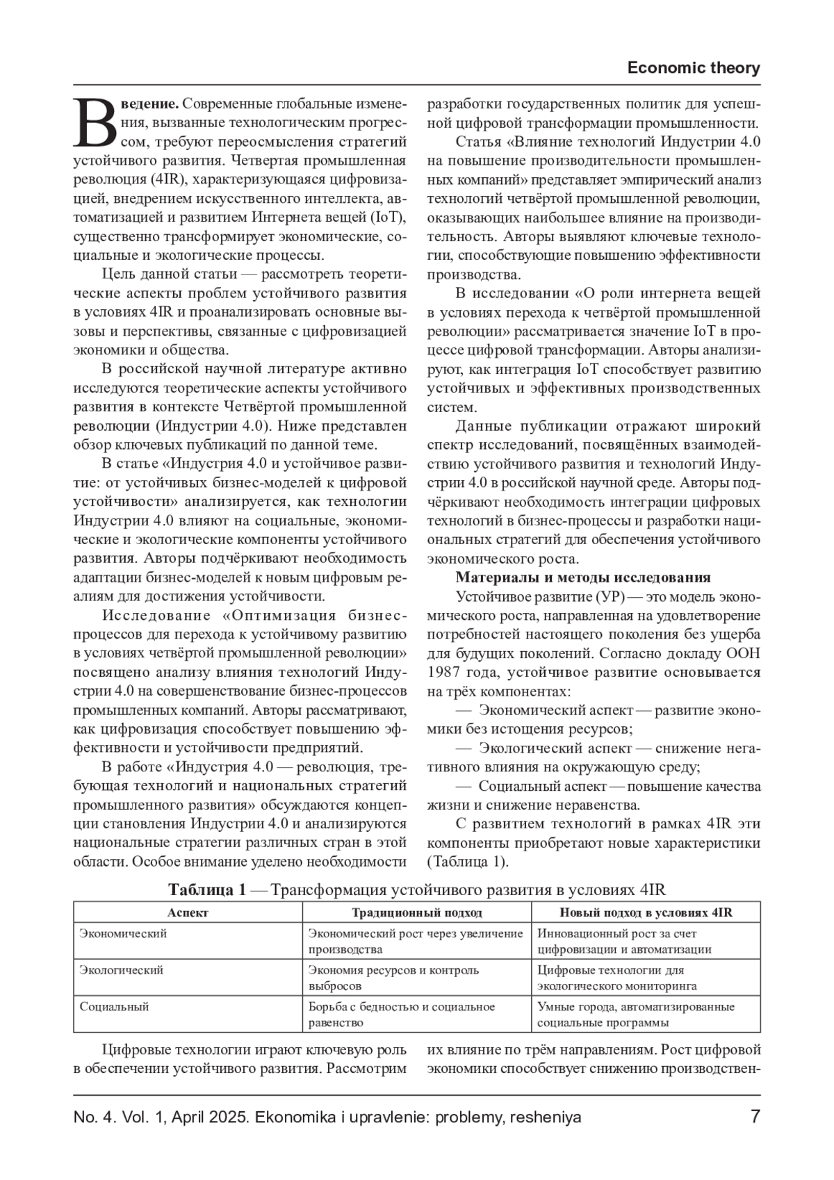 Современные глобальные изменения, вызванные технологическим прогрессом, требуют переосмысления стратегий устойчивого развития. Четвертая промышленная революция (4IR), характеризующаяся цифровизацией, внедрением искусственного интеллекта, автоматизацией и развитием Интернета вещей (IoT), существенно трансформирует экономические, социальные и экологические процессы.