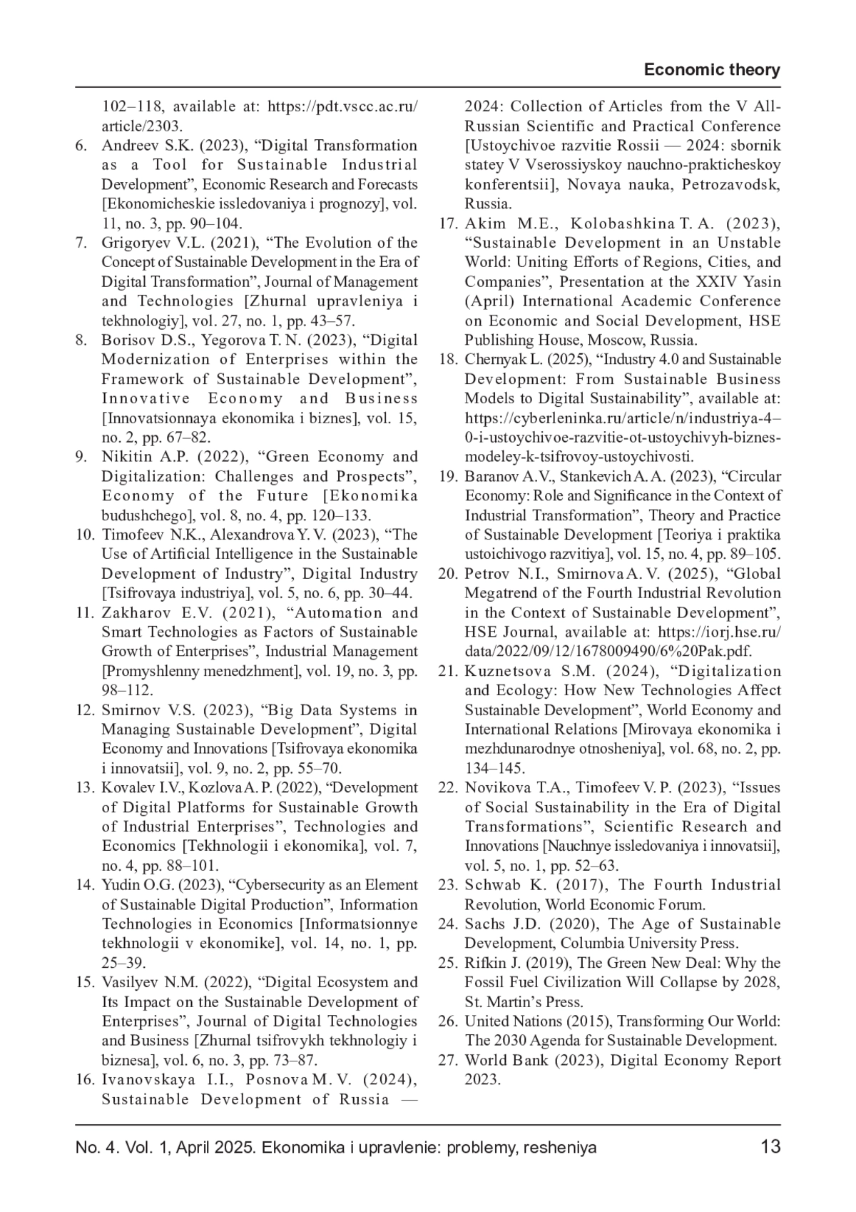 6. Андреев С. К. Цифровая трансформация как инструмент устойчивого развития промышленности // Экономические исследования и прогнозы. - 2023. - Т. 11, № 3. - С. 90-104.