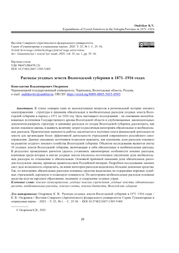 Важной задачей земских учреждений второй половины XIX – начала XX века было формирование земских бюджетов, в которых существенную роль играли расходные статьи, необходимые для обеспечения местных потребностей населения. В настоящий момент одним из неизученных вопросов являются уездные земские расходы Вологодской губернии во второй половине XIX – начале XX ве- ка. В современных условиях особенно актуальным становится обращение к опыту самофинансирования земских учреждений для решения региональных проблем расходования денежных средств.