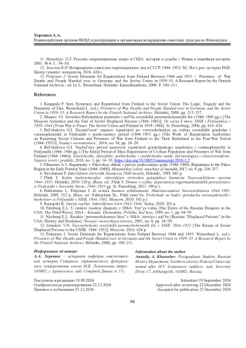 13. Pohjonen J. Soviet Demands for Repatriations from Finland Between 1944 and 1955 // Prisoners of War Deaths and People Handed over to Germany and the Soviet Union in 1939-55. A Research Report by the Finnish National Archives / ed. by L. Westerlund. Helsinki: Kansallisarkisto, 2008. P. 180-211.