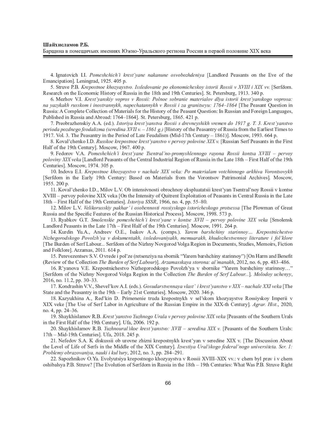 20. Шайхисламов Р.Б. Южноуральское крестьянство: XVII - середина XIX в.: моногр. Уфа: РИЦ БашГУ, 2018. 245 с. EDN: YNXUAX