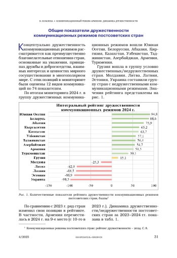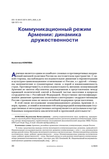 В статье представлены результаты мониторинга дружественности коммуникационных режимов постсоветских стран, в частности Армении, а также особенности репрезентации России в армянском дискурсе, описываются выявленные противоречия и расколы в армянском обществе.