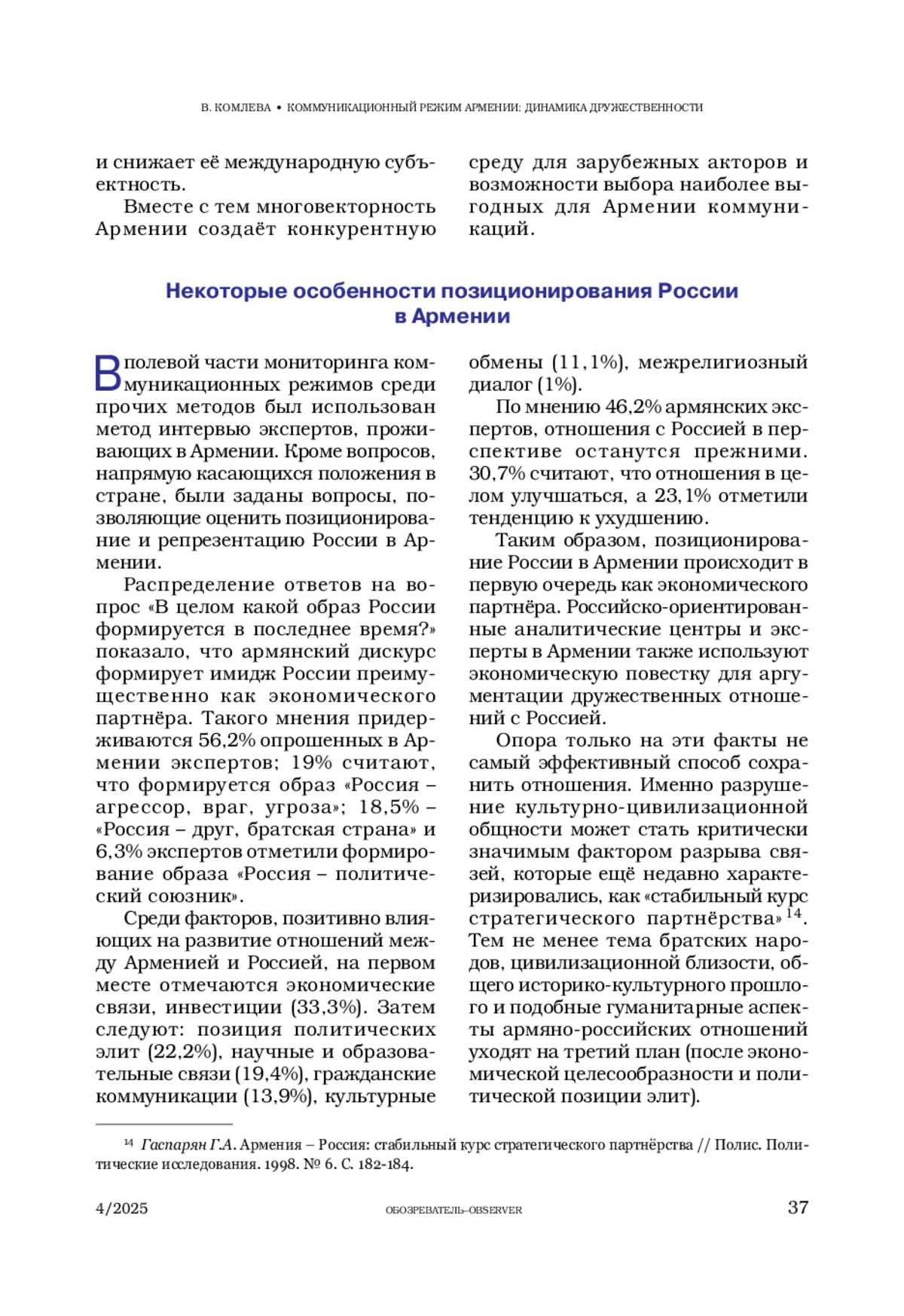 3. Гаспарян Г.А. Армения - Россия: стабильный курс стратегического партнёрства // Полис. Политические исследования. 1998. № 6. С. 182-184.
