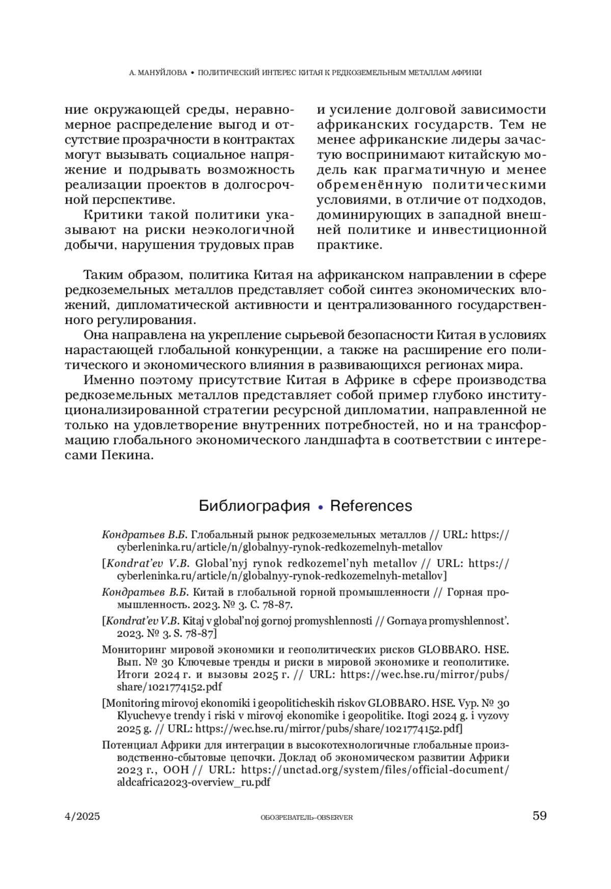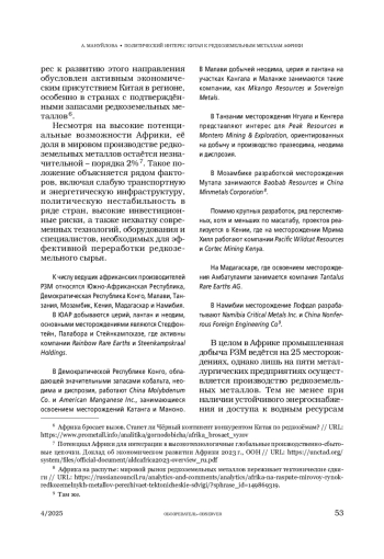 В статье рассмотрена политика Китая по редкоземельным металлам в Африке как элемент его глобальной стратегии обеспечения доступа к критически важным ресурсам. Анализируются значимость редкоземельных металлов для высокотехнологичных отраслей, инвестиционные механизмы КНР, модель «ресурсы в обмен на развитие» и взаимодействие с африканскими государствами.