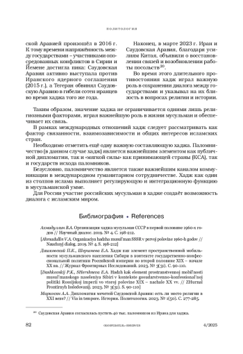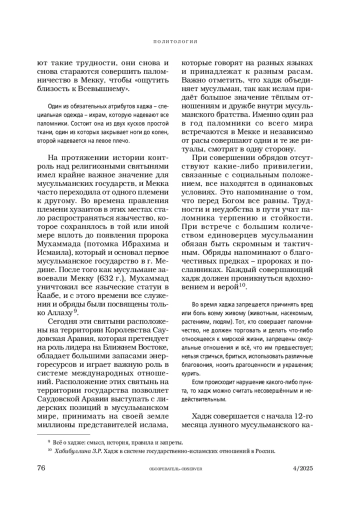 5. Хабибуллина З.Р. Хадж в системе государственно-исламских отношений в России: история и современность // Политика и Общество. 2024. № 4. С. 30-39.
