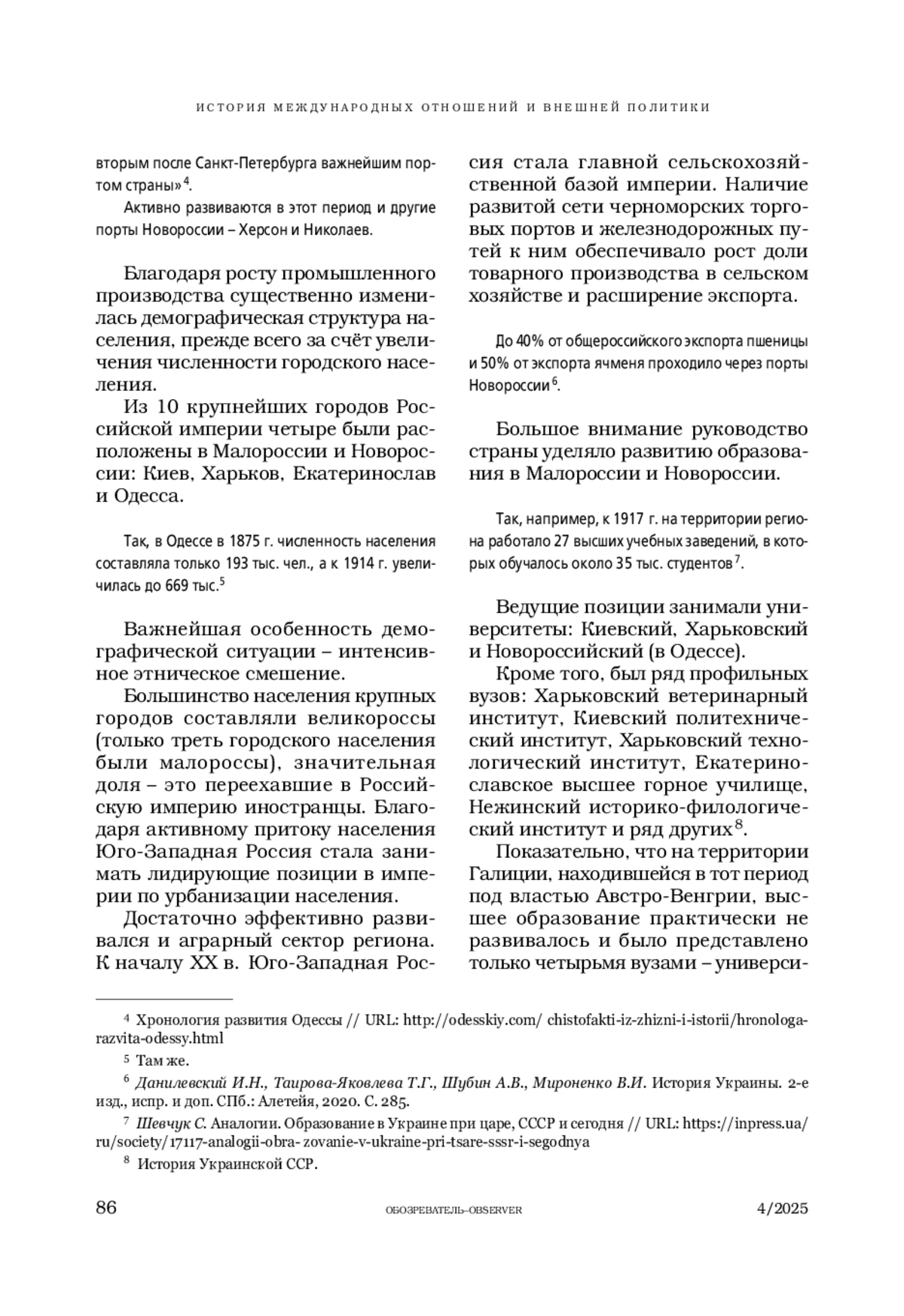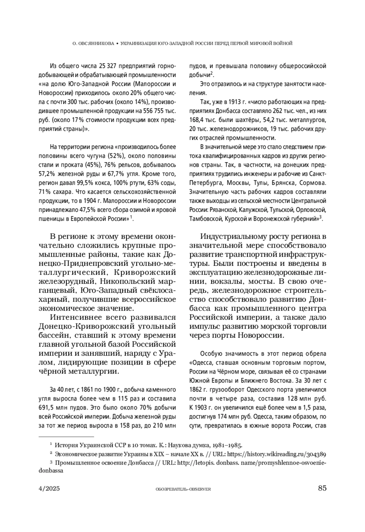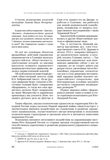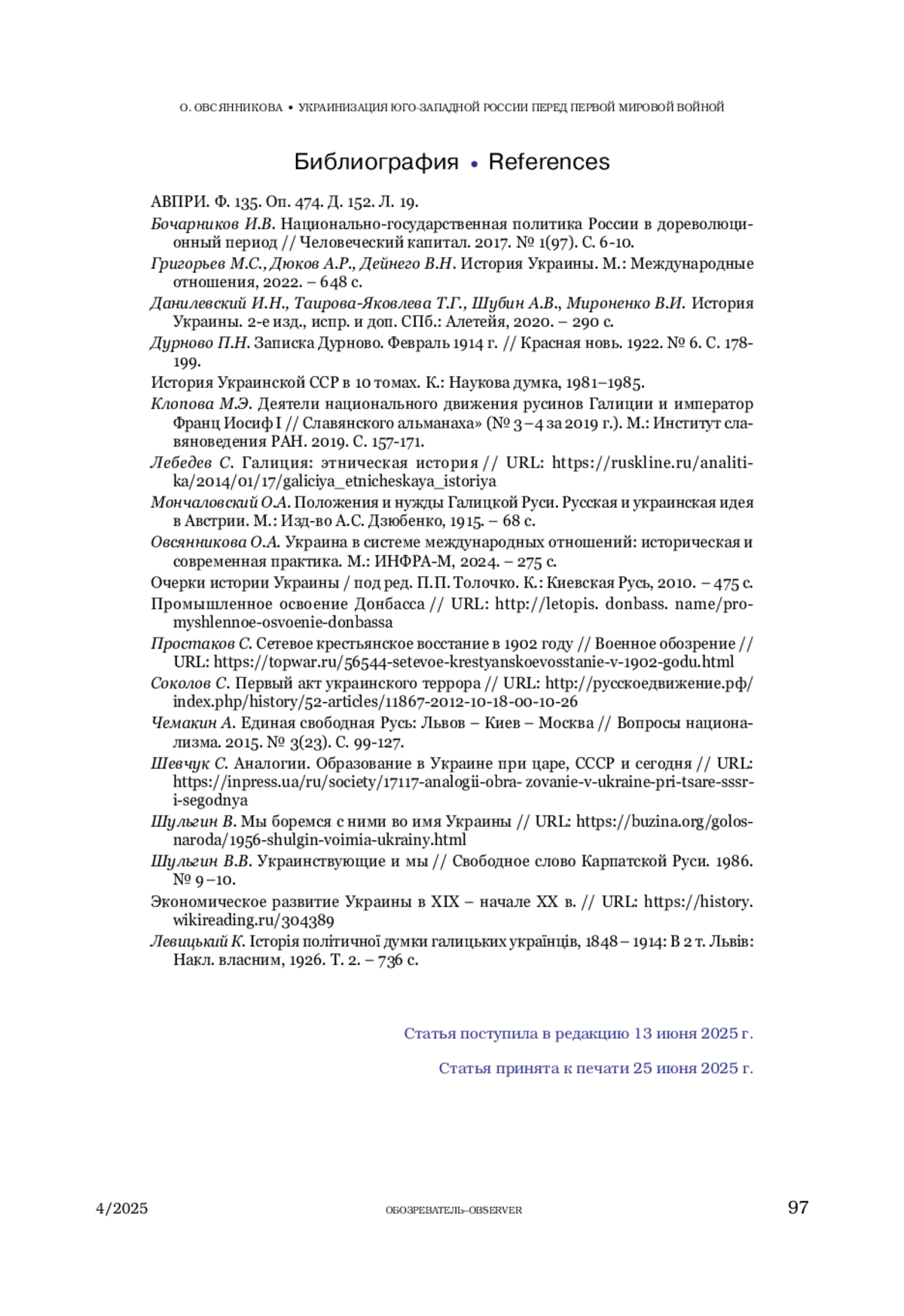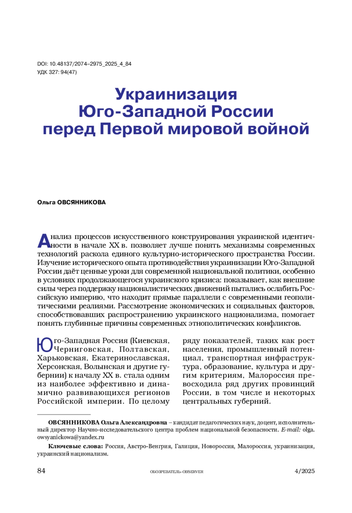 ОВСЯННИКОВА О. А. УКРАИНИЗАЦИЯ ЮГО-ЗАПАДНОЙ РОССИИ ПЕРЕД ПЕРВОЙ МИРОВОЙ ВОЙНОЙ // ОБОЗРЕВАТЕЛЬ. 2025. № 4