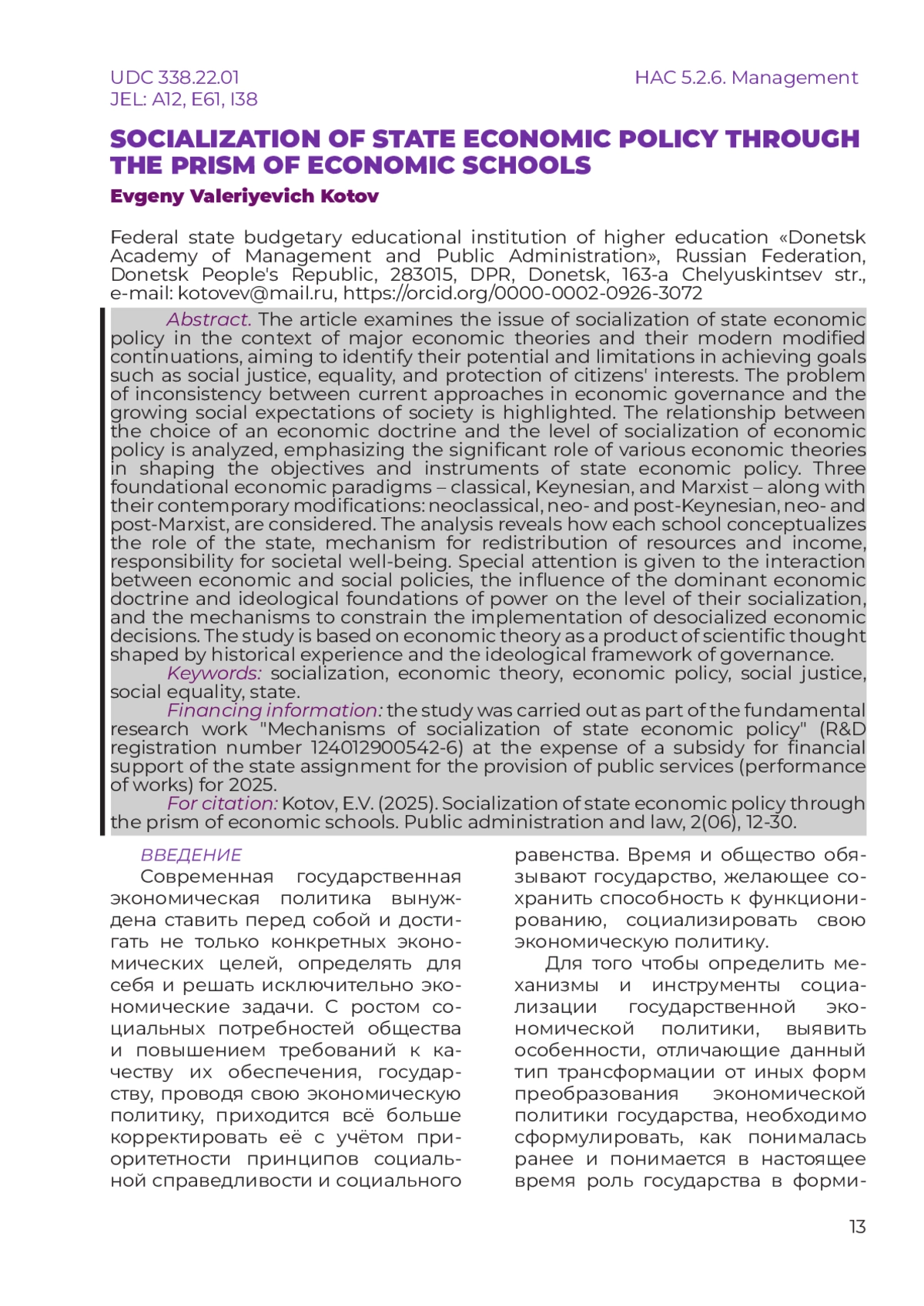 В статье рассмотрена проблема социализаци государственной экономической политики в контексте основных экономических теорий и их модифицированных современных продолжений для выявления их возможностей и ограничений в достижении целей социальной справедливости, равенства и защиты интересов населения. Выделена проблема несоответствия текущих подходов в экономическом управлении требованиям растущих социальных ожиданий общества. Раскрыта связь между выбором экономической доктрины и уровнем социализации экономической политики, подчёркивается важная роль различных экономических теорий в формулировании целей и инструментариев осуществления государственной экономической политики. Рассмотрены три базовые экономические парадигмы – классическая, кейнсианская и марксистская, а также их современные модификации: неоклассическая, нео- и посткейнсианская, нео- и постмарксистская. Проведенный анализ позволяет определить, как каждая из этих школ понимает роль государства, механизм перераспределения ресурсов и доходов, ответственность за социальное благополучие общества. Особое внимание уделено взаимодействию экономической и социальной политики, влиянию доминирующей экономической доктрины и идеологического базиса власти на уровень их социализации, механизмам сдерживания реализации десоциализированных решений в экономической политике. Исследование опирается на экономическую теорию как продукт научной мысли, формируемый под влиянием исторического опыта и идеологического базиса власти.