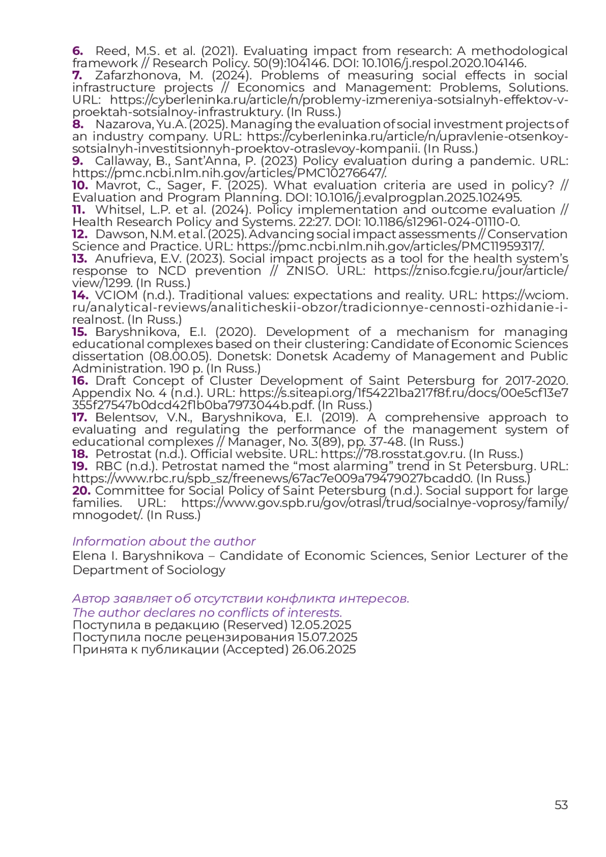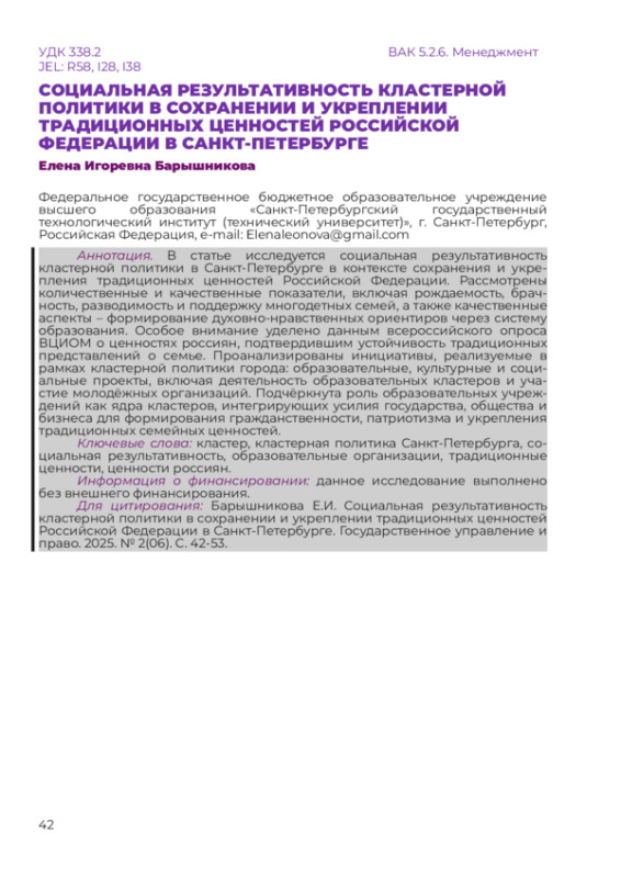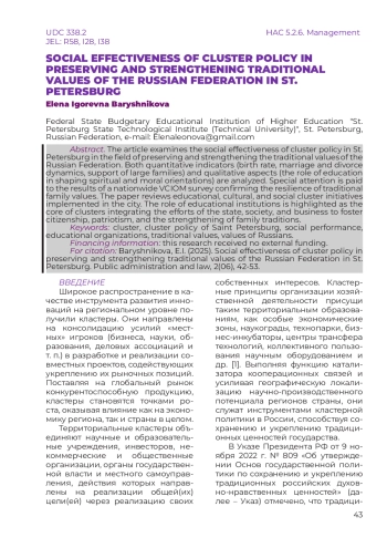 БАРЫШНИКОВА Е. И. СОЦИАЛЬНАЯ РЕЗУЛЬТАТИВНОСТЬ КЛАСТЕРНОЙ ПОЛИТИКИ В СОХРАНЕНИИ И УКРЕПЛЕНИИ ТРАДИЦИОННЫХ ЦЕННОСТЕЙ РОССИЙСКОЙ ФЕДЕРАЦИИ В САНКТ-ПЕТЕРБУРГЕ // НАУЧНЫЙ ЖУРНАЛ "ГОСУДАРСТВЕННОЕ УПРАВЛЕНИЕ И ПРАВО". 2025. № 2 (6)