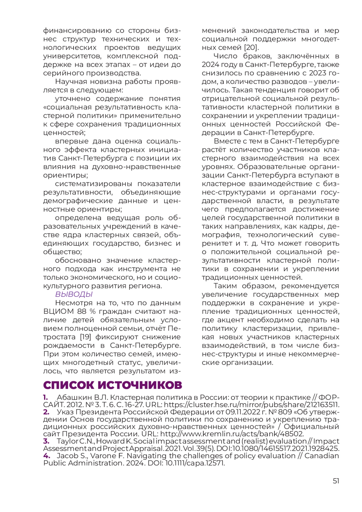 Статья: СОЦИАЛЬНАЯ РЕЗУЛЬТАТИВНОСТЬ КЛАСТЕРНОЙ ПОЛИТИКИ В СОХРАНЕНИИ И УКРЕПЛЕНИИ ТРАДИЦИОННЫХ ЦЕННОСТЕЙ РОССИЙСКОЙ ФЕДЕРАЦИИ В САНКТ-ПЕТЕРБУРГЕ (2025)