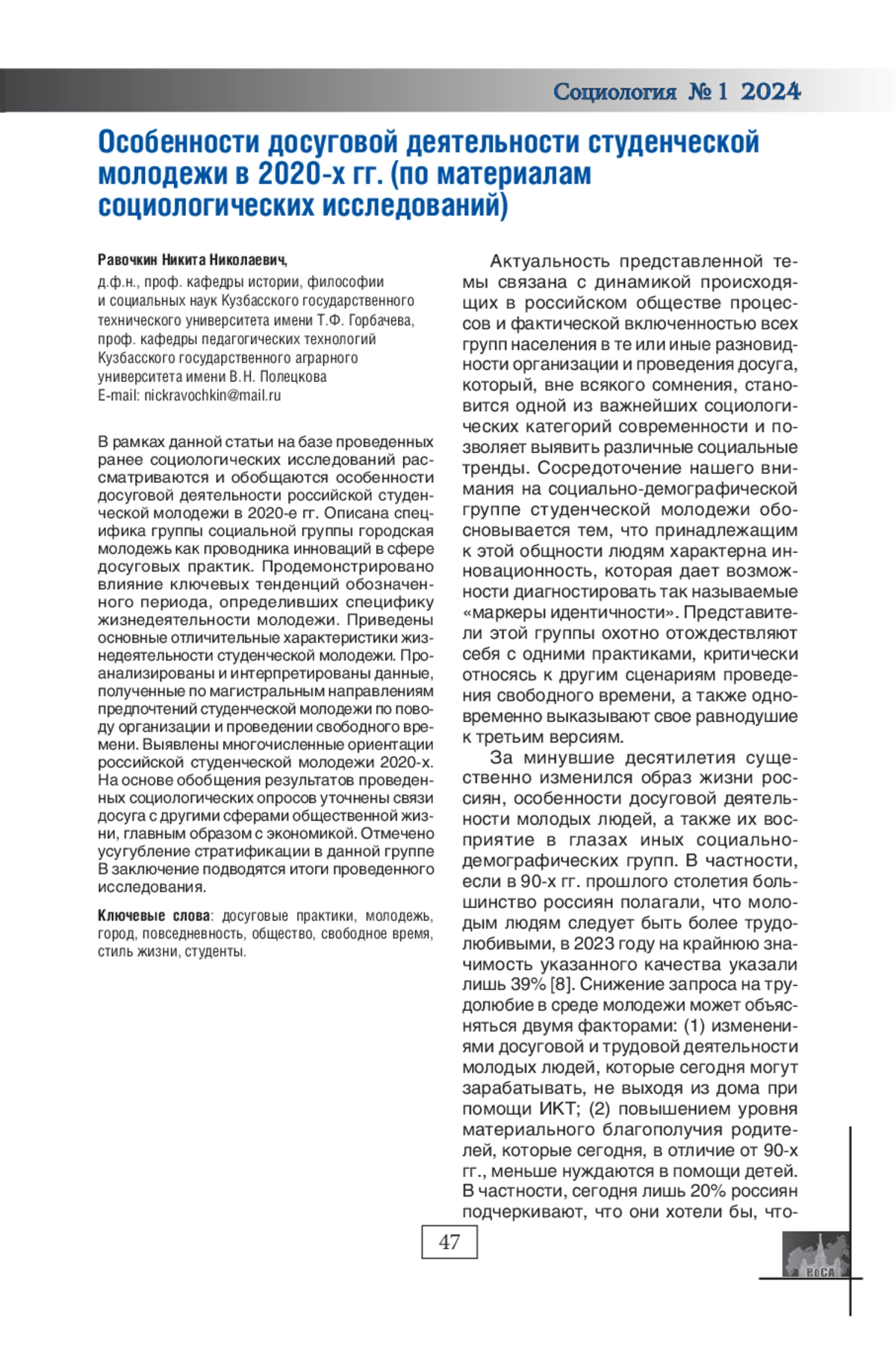 В рамках данной статьи на базе проведенных ранее социологических исследований рассматриваются и обобщаются особенности досуговой деятельности российской студенческой молодежи в 2020-е гг. Описана специфика группы социальной группы городская молодежь как проводника инноваций в сфере досуговых практик. Продемонстрировано влияние ключевых тенденций обозначенного периода, определивших специфику жизнедеятельности молодежи. Приведены основные отличительные характеристики жизнедеятельности студенческой молодежи. Проанализированы и интерпретированы данные, полученные по магистральным направлениям предпочтений студенческой молодежи по поводу организации и проведении свободного времени. Выявлены многочисленные ориентации российской студенческой молодежи 2020-х. На основе обобщения результатов проведенных социологических опросов уточнены связи досуга с другими сферами общественной жизни, главным образом с экономикой. Отмечено усугубление стратификации в данной группе В заключение подводятся итоги проведенного исследования.