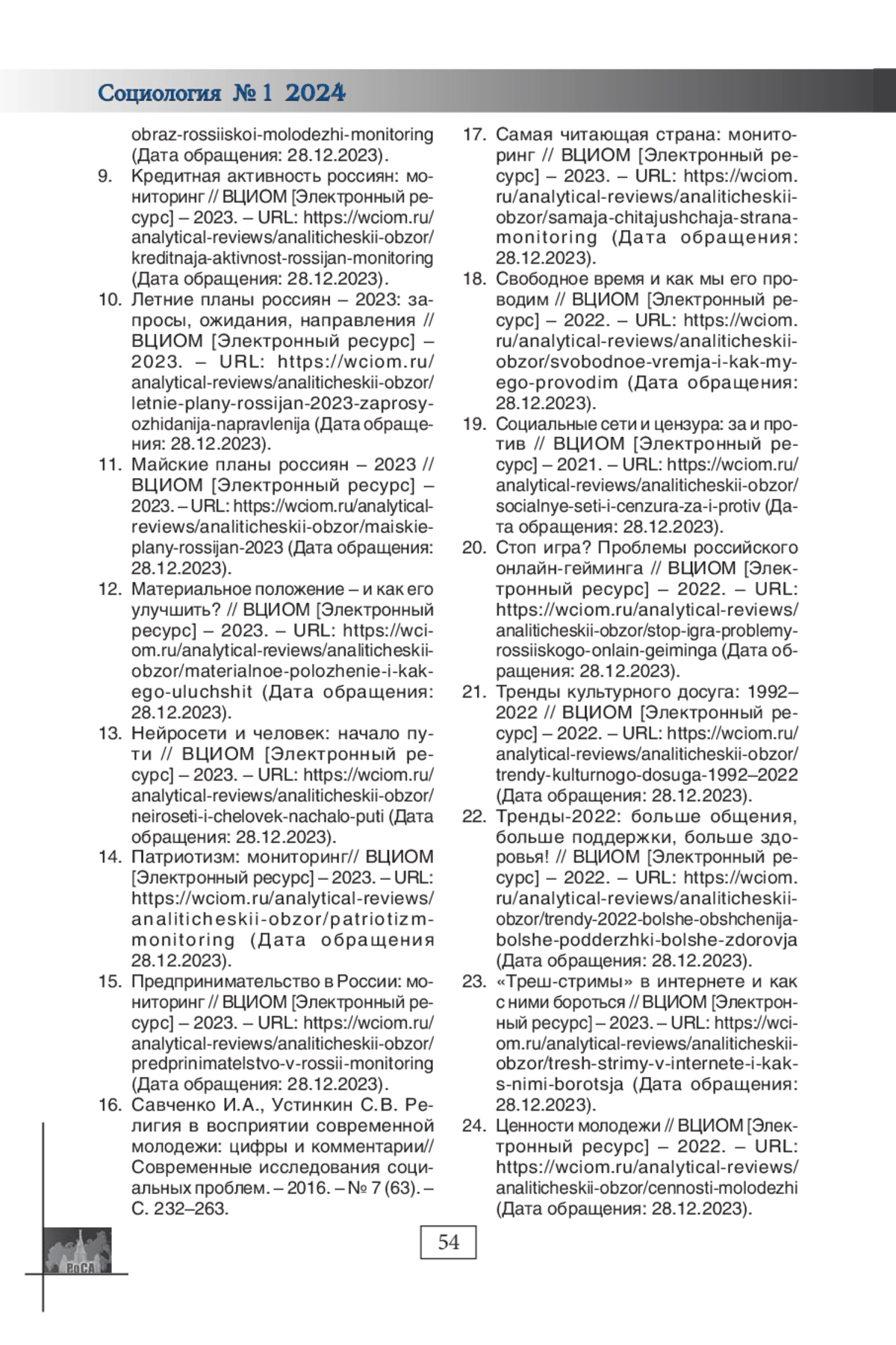 24. Ценности молодежи // ВЦИОМ [Электронный ресурс] - 2022. - URL: https://wciom.ru/analytical-reviews/analiticheskii-obzor/cennosti-molodezhi (Дата обращения: 28.12.2023).