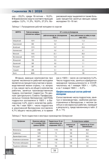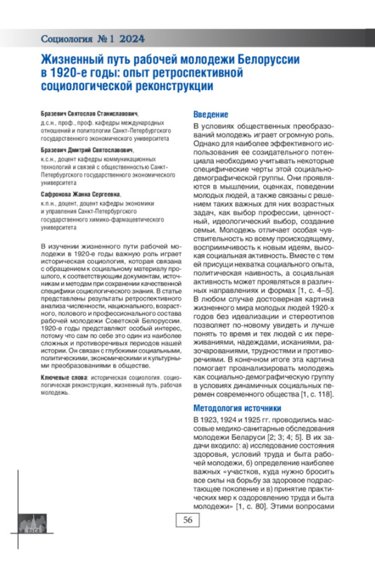В изучении жизненного пути рабочей молодежи в 1920-е годы важную роль играет историческая социология, которая связана с обращением к социальному материалу прошлого, к соответствующим документам, источникам и методам при сохранении качественной специфики социологического знания. В статье представлены результаты ретроспективного анализа численности, национального, возрастного, полового и профессионального состава рабочей молодежи Советской Белоруссии. 1920-е годы представляют особый интерес, потому что сам по себе это один из наиболее сложных и противоречивых периодов нашей истории. Он связан с глубокими социальными, политическими, экономическими и культурными преобразованиями в обществе.