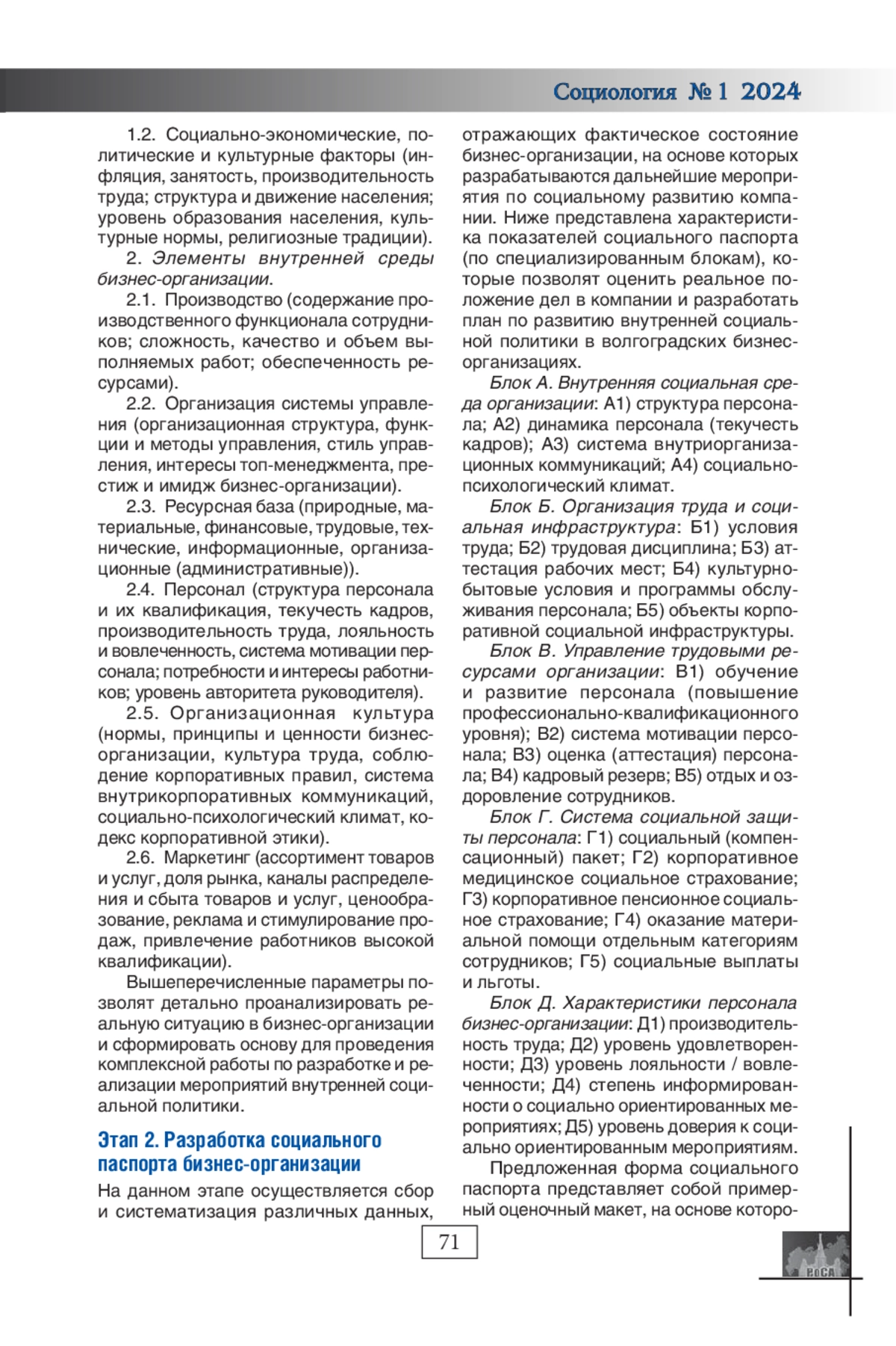 В статье представлен анализ основных этапов стратегии совершенствования системы управления внутренней социальной политикой волгоградских бизнес-организаций: анализ внутренней и внешней среды бизнесорганизации; разработка социального паспорта бизнес-организации; определение ключевых социально-культурных характеристик сотрудников и их учет в формировании целевых установок внутренней социальной политики; выявление категорий внутренних стейкхолдеров и построение организационной структуры управления внутренней социальной политикой; выбор приоритетных направлений внутренней социальной политики; выбор методов управления и инструментов внутренней социальной политики; создание системы информирования внутренних стейкхолдеров о реализуемых мероприятиях внутренней социальной политики; презентация разработанной программы внутренней социальной политики и её оценка сотрудниками; реализация доработанной программы внутренней социальной политики и подготовка социального (нефинансового) отчета по результатам социально ориентированной деятельности. В конце статьи отмечена универсальность использования разработанной стратегии совершенствования системы управления внутренней социальной политикой волгоградскими бизнес-организациями.