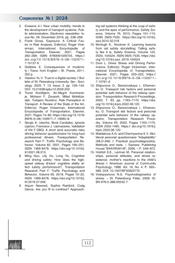 12. Shipunova O., Berezovskaya I., Efremenko O. Transport risk factors and personal potential safe behavior of the railway operator. Transportation Research Procedia. 2022. Т. 63. С. 1163-1170. DOI: 10.1016/j.trpro.2022.06.120 EDN: FQVOIL