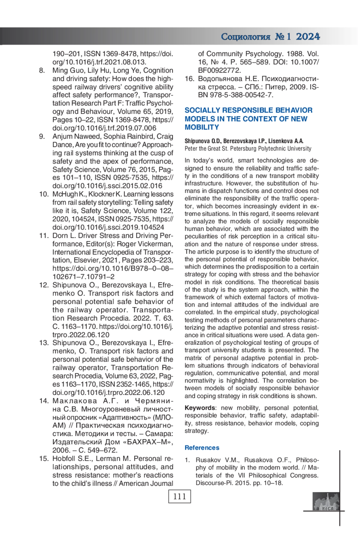 13. Shipunova O., Berezovskaya I., Efremenko, O. Transport risk factors and personal potential safe behavior of the railway operator, Transportation Research Procedia, Volume 63, 2022, Pages 1163-1170, ISSN 2352-1465,. DOI: 10.1016/j.trpro.2022.06.120 EDN: FQVOIL