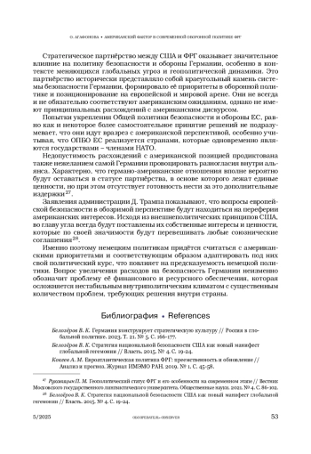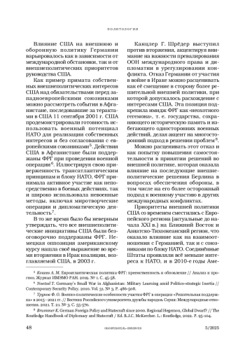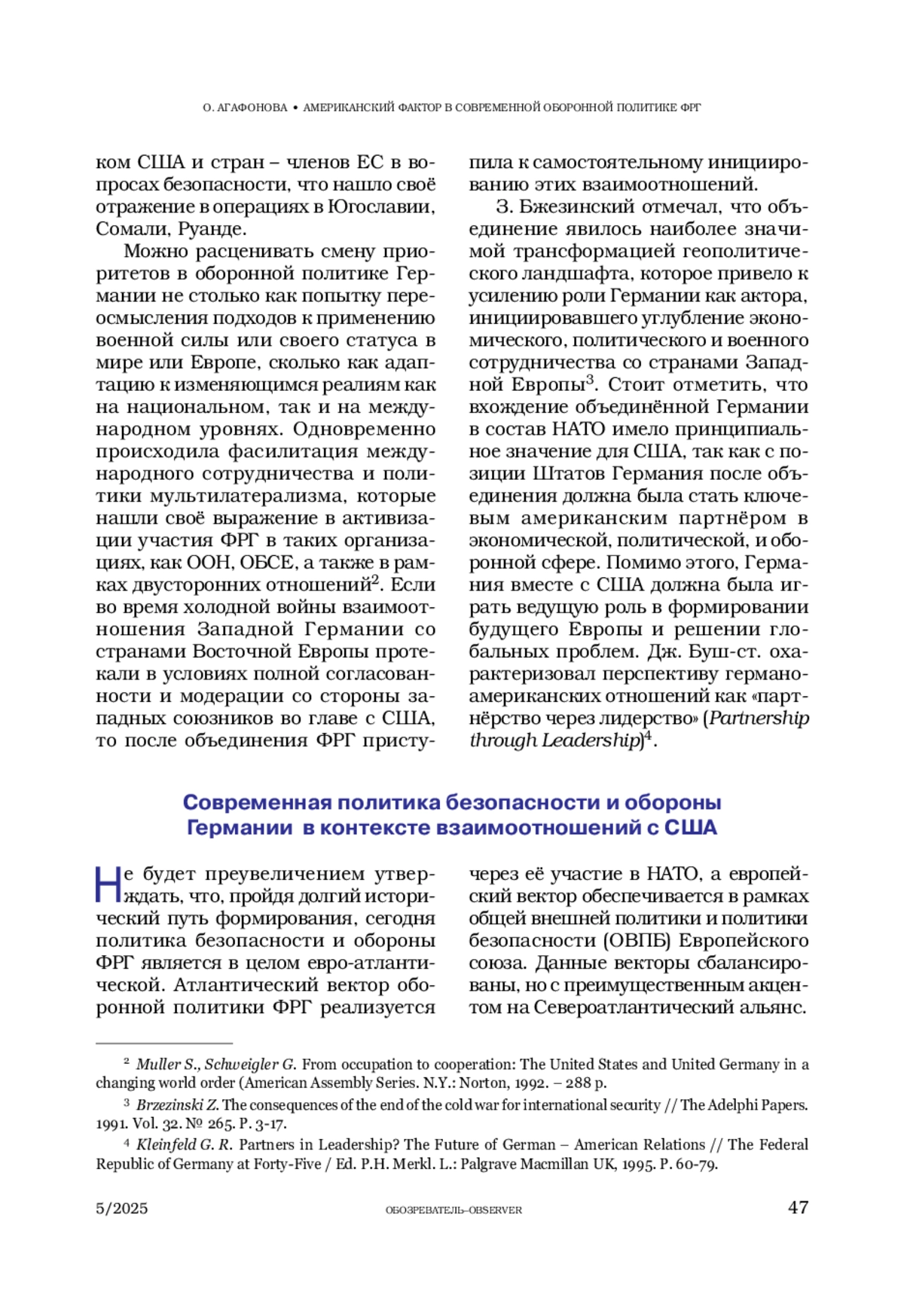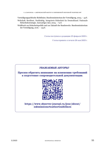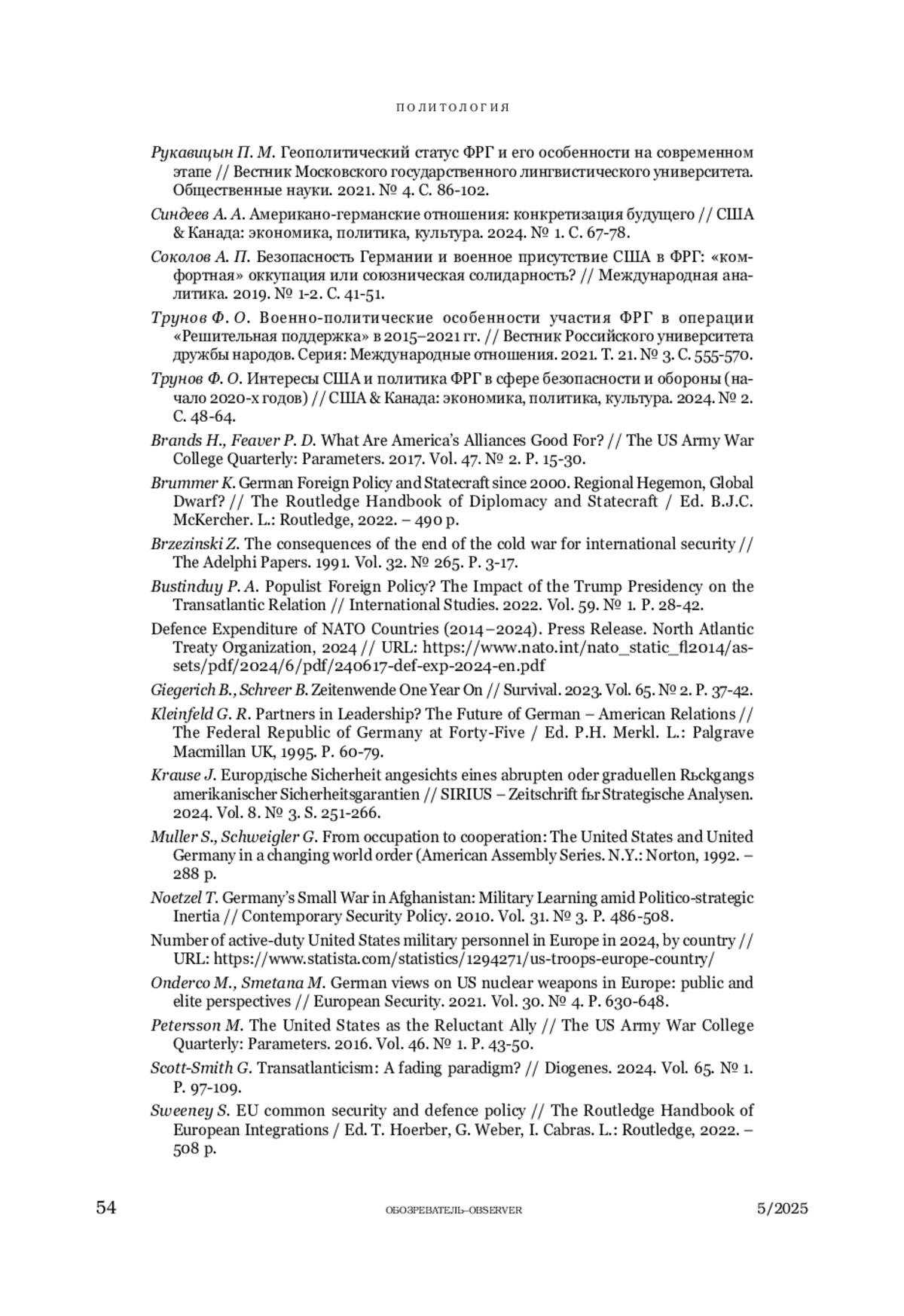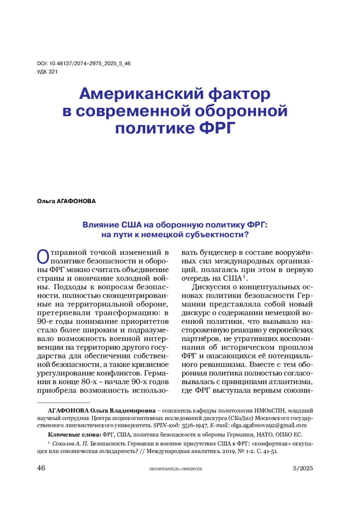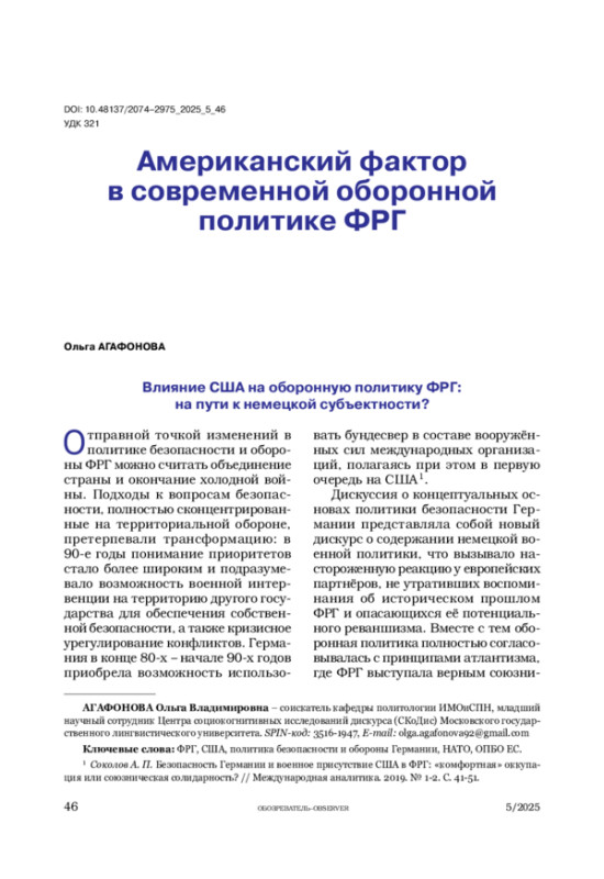 АГАФОНОВА О. В. АМЕРИКАНСКИЙ ФАКТОР В СОВРЕМЕННОЙ ОБОРОННОЙ ПОЛИТИКЕ ФРГ // ОБОЗРЕВАТЕЛЬ. 2025. № 5