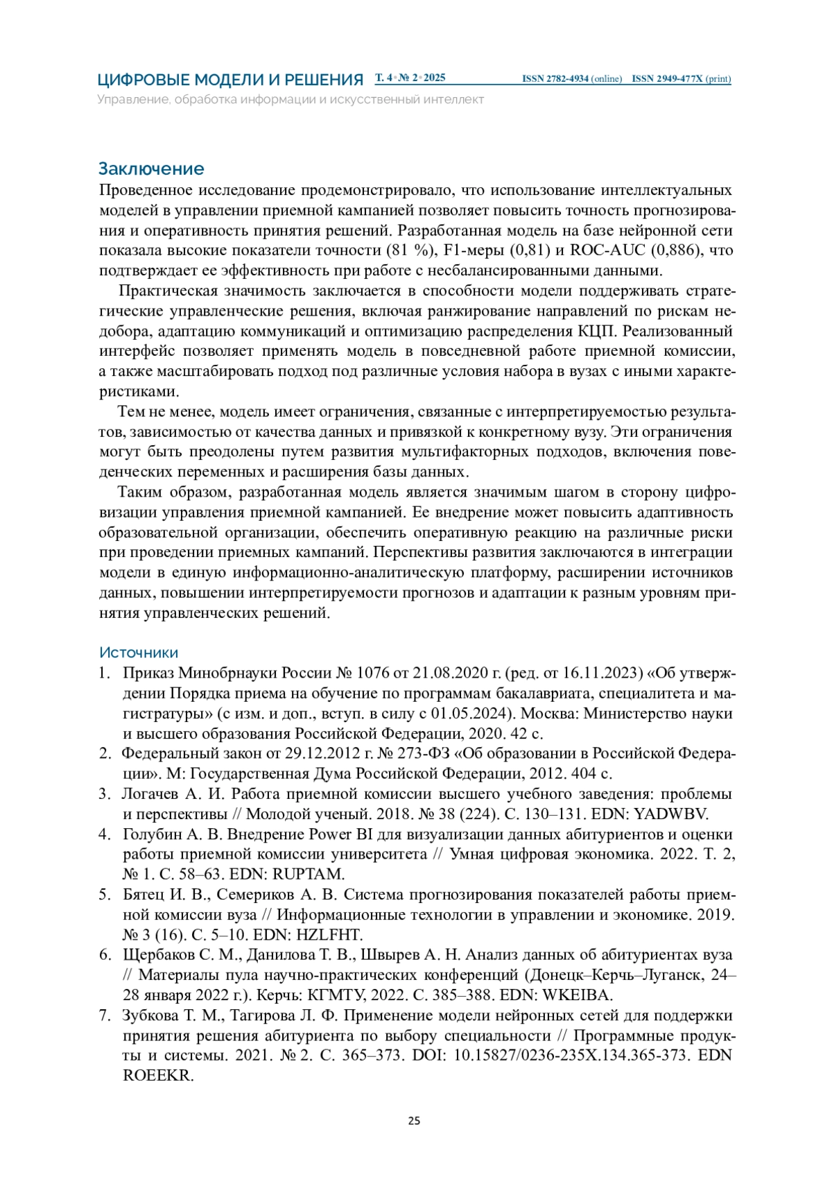 В статье раскрываются теоретические и прикладные аспекты информационно-аналитической поддержки управления приемной кампанией вуза в условиях цифровой трансформации. Особое внимание уделено возможностям применения интеллектуальных технологий для повышения управляемости процессов набора. Описана модель прогнозирования вероятности зачисления на основе нейросетевых алгоритмов, а также ее архитектурные и интеграционные решения. Представлены ограничения предложенного подхода. Обоснована актуальность использования подобных инструментов для повышения прозрачности и эффективности образовательного менеджмента. В результате эффективность модели подтверждена высокими значениями точности классификации и ROC-AUC, что демонстрирует ее прикладной потенциал в рамках реальных приемных кампаний