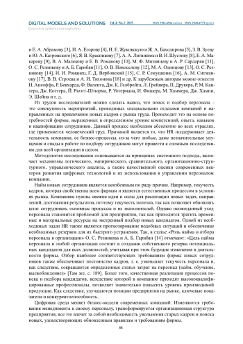 7. Красникова Я. В. Цифровые технологии в управлении персоналом // Гуманитарный научный журнал. 2020. № 1. С. 77-83. DOI: 10.24411/2078-9661-2020-10011 EDN: BXYXVY