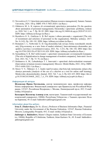9. Макарова Е. А. Ключевые технологии цифровой трансформации в сфере HR: тенденции в сфере управления персоналом в России // Международный научно-исследовательский журнал. 2022. № 1-3 (115). С. 30-34. DOI: 10.23670/IRJ.2022.115.1.075 EDN: HINHZH