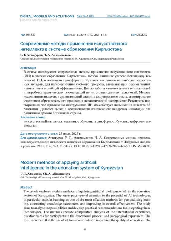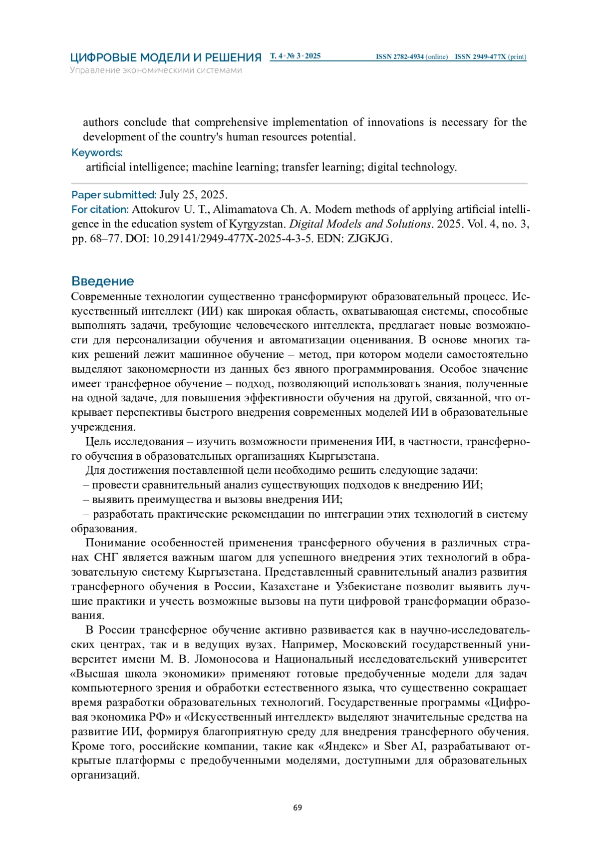 В статье исследуются современные методы применения искусственного интеллекта (ИИ) в системе образования Кыргызстана. Особое внимание уделено потенциалу технологий ИИ, в частности трансферного обучения как одного из наиболее эффективных методов, для персонализации учебного процесса, автоматизации оценки знаний и повышения его общей эффективности. Целью работы является анализ возможностей и разработка практических рекомендаций по интеграции данных технологий. Методы исследования включают сравнительный анализ международного опыта, анкетирование участников образовательного процесса и педагогический эксперимент. Результаты подтверждают, что применение инструментов ИИ способствует повышению качества образования. Делается вывод о необходимости комплексного внедрения инноваций для развития кадрового потенциала страны.